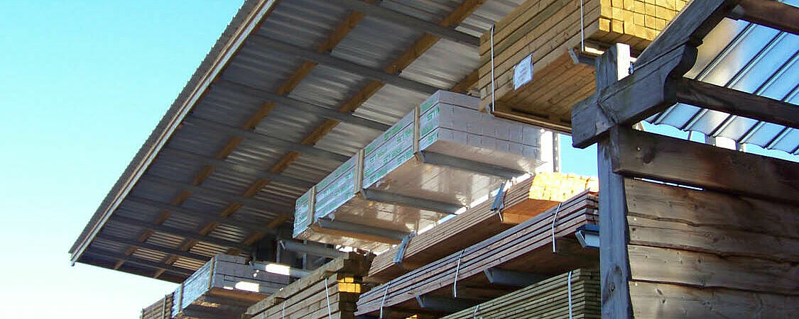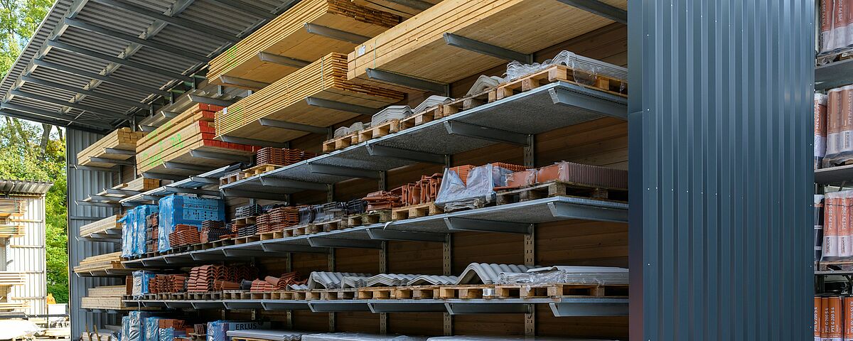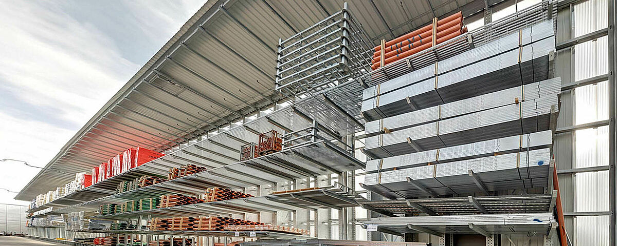 En este tipo de naves, los soportes verticales de las estanterías cantilever se cortan en ángulo en la parte superior, dependiendo de la forma del tejado, y se colocan con paneles o soportes de correas. Sobre ella se construirá después la estructura del techo para la nave de estanterías cantilever. Para el revestimiento de las paredes, pueden fijarse en la parte trasera de las estanterías chapas trapezoidales o paneles ISO de protección contra el ruido o sistemas de protección contra la intemperie.