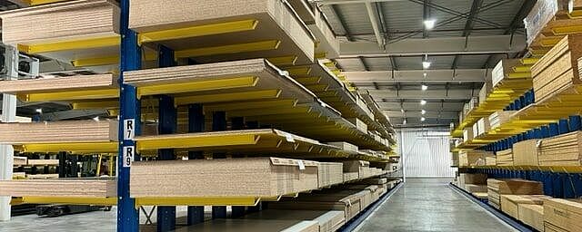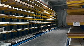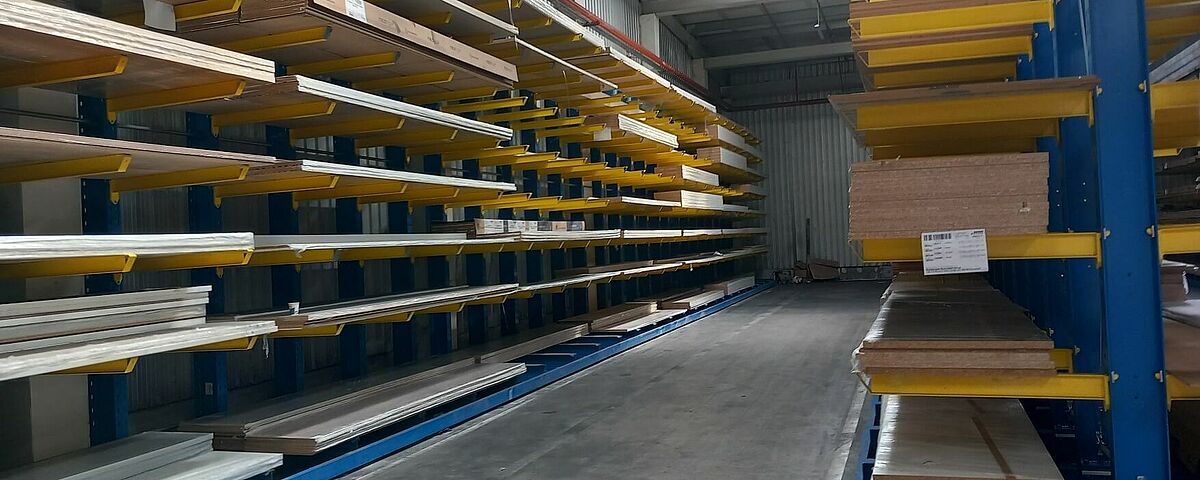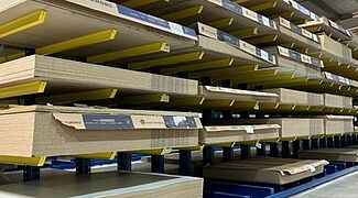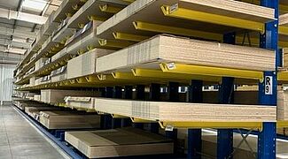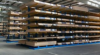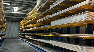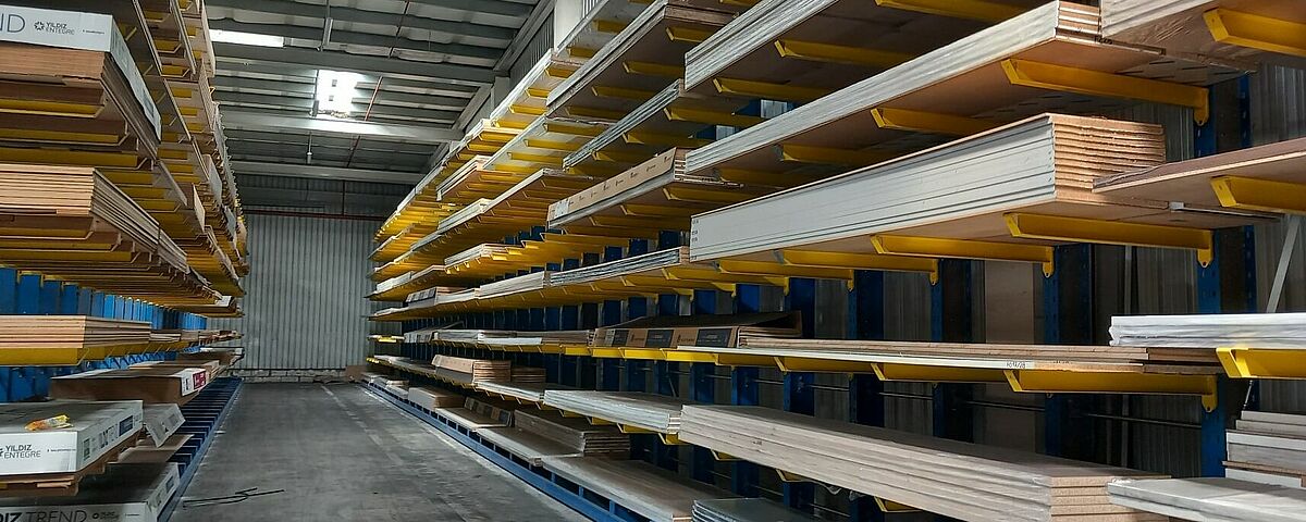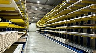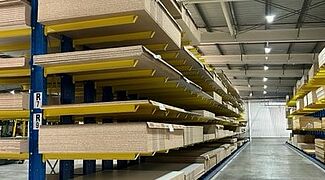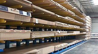 Por ello, Arabesque decidió sustituir el almacenamiento en el suelo por varias filas de estanterías cantiléver de OHRA. Las estanterías tienen una altura de hasta 5.280 milímetros, los brazos de 1.200 milímetros de longitud soportan cargas de hasta 850 kilogramos. Todas las estanterías están equipadas con guías de conducción, de modo que el espacio necesario para los pasillos de las estanterías se reduce al mínimo y, sin embargo, la carretilla elevadora multidireccional puede entrar y operar fácilmente en los pasillos.