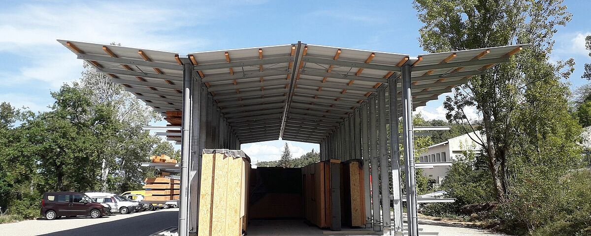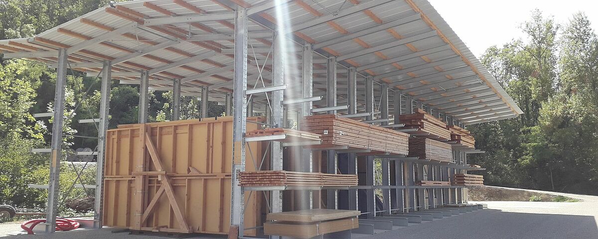 Bati-Nature también siguió su propio camino en la planificación de su nuevo almacén: Se trataba de crear una mayor capacidad de almacenamiento tanto para la madera de construcción, las vigas y otros materiales de madera, como para los elementos de pared, de varios metros de ancho y alto, fabricados en entramado de madera y aislados con paja. En lugar de construir convencionalmente una nave para los elementos de pared e instalar estanterías separadas para los materiales de madera, la empresa combinó ambas soluciones con la ayuda de OHRA.