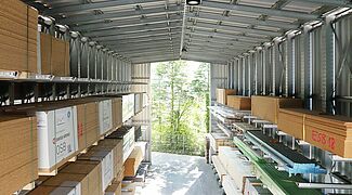 Antes de la reorganización de la zona de almacenamiento, los productos de madera de Lorup se almacenaban en distintas zonas de la sede, parte en la nave principal y parte sin protección contra la intemperie en el exterior. La longitud de las vigas y listones almacenados era limitada debido al espacio de almacenamiento. La capacidad de almacenamiento estaba casi agotada.