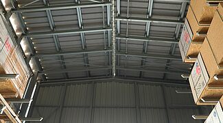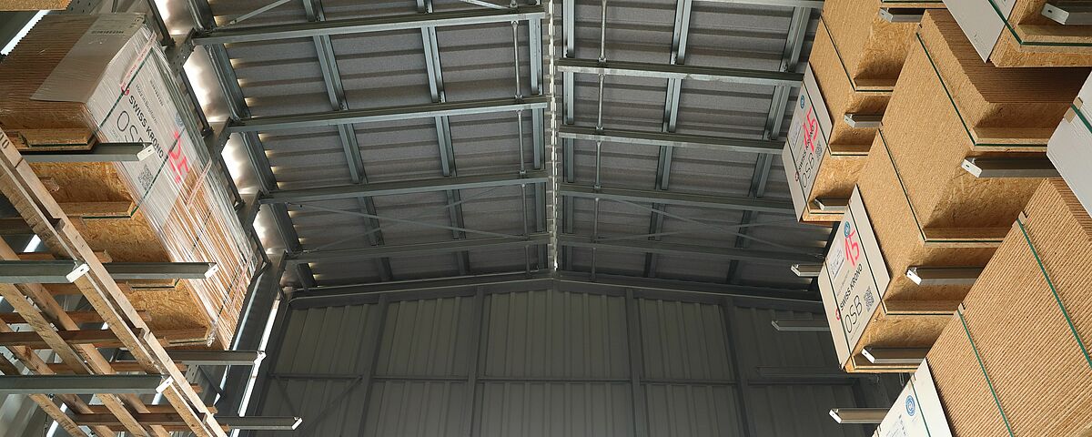 Los lineales de estanterías están alineados a lo largo de una dirección con pendiente. Las estanterías pueden compensar con facilidad la diferencia de altura de unos 14 centímetros a lo largo de las mismas, ya que los brazos cantiléver de las estanterías OHRA están suspendidos de forma adaptable en una estrecha matriz de agujeros. Para compensar la segunda pendiente en sentido transversal a las filas de estanterías en la estructura de techo, OHRA realizó una cumbrera de diseño variable. Los brazos del techo de las filas de estanterías no están conectados entre sí, sino que queda un "hueco" de unos 10 centímetros entre ellos. Se cubre con una tapa de cumbrera flexible para que el interior de la nave permanezca seco. Esta solución de cumbrera no solo compensa la diferencia de altura entre las filas de estanterías, sino que también garantiza que las vibraciones y tensiones que se producen durante el almacenamiento, por ejemplo, no se transfieran de una fila de estanterías a la otra. De este modo, la estructura de techo queda protegida de los daños en la cubierta.