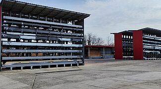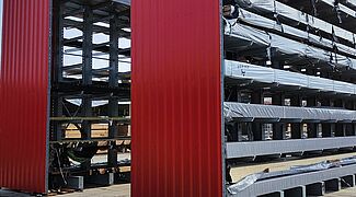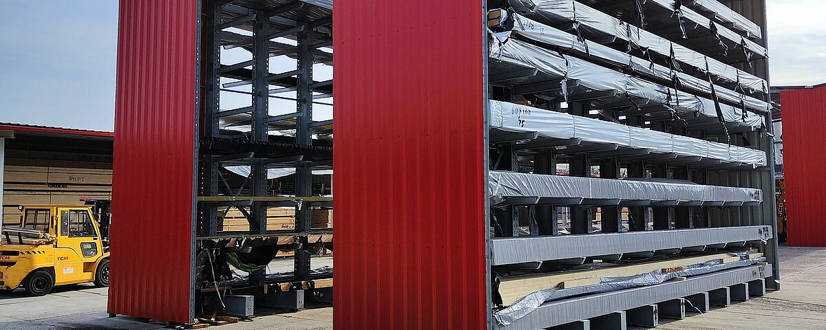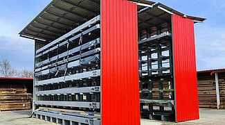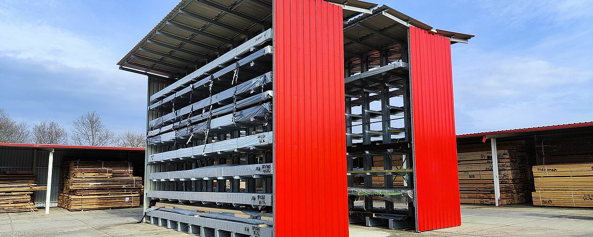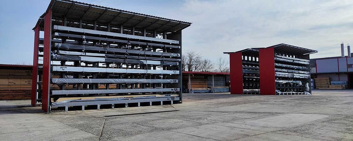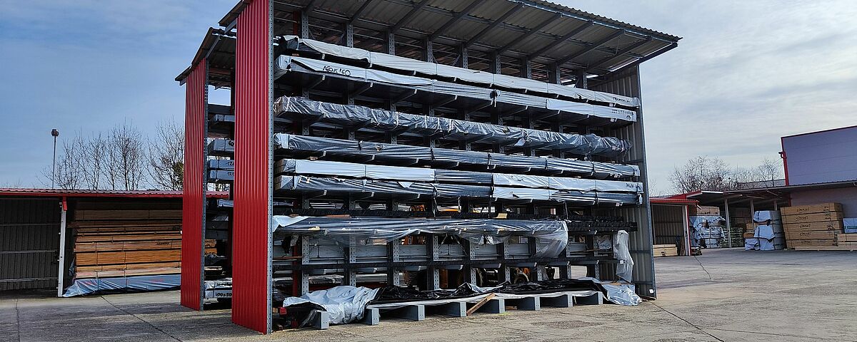 Hasta ahora, Borovi almacenaba su madera apilada bajo cubiertas. Sin embargo, el almacenamiento en el suelo ocupaba mucho espacio, y acceder a cada artículo requería repetidos procesos de reabastecimiento, lo que conllevaba mucho tiempo. Por ello, el maderero decidió aumentar la capacidad de almacenamiento mediante estanterías cantiléver. Para proteger la madera de la intemperie, las estanterías se equiparon con un tejado de 2,7 metros de profundidad en ambos lados. En las caras frontales de las estanterías se montaron marcos expositores que soportan una chapa trapezoidal con recubrimiento de polvo como panel lateral. Además, las columnas de la estantería están equipadas con perfiles en U en los que se pueden insertar tablero. El tablestacado resultante también protege la madera de las precipitaciones. Este método de construcción ahorró a Borovi la laboriosa y costosa construcción de un nuevo almacén.