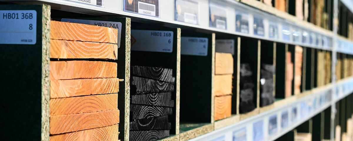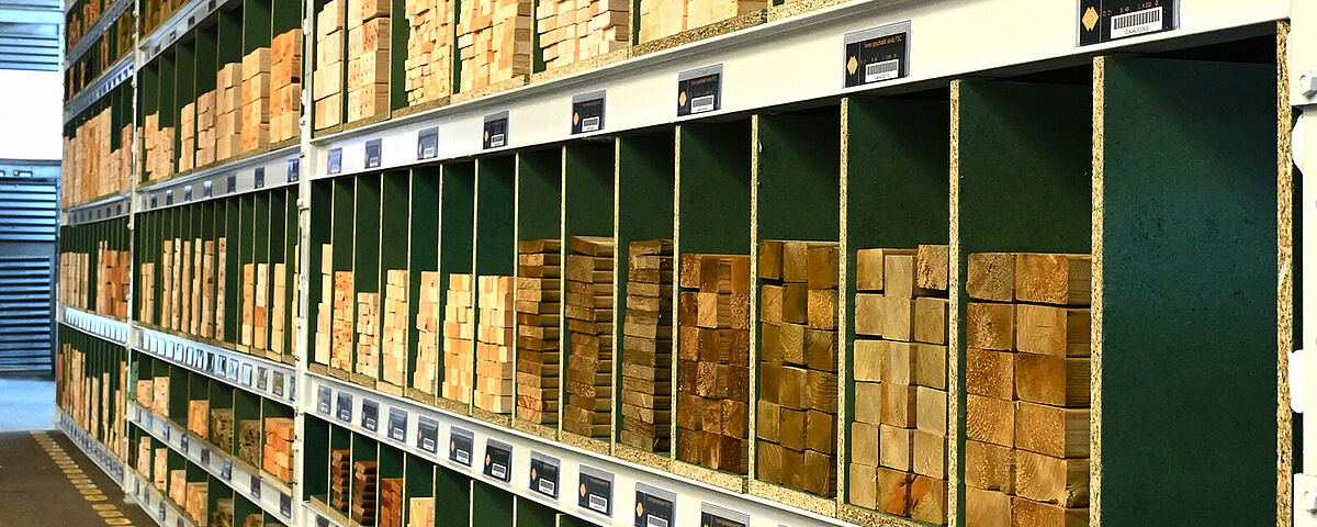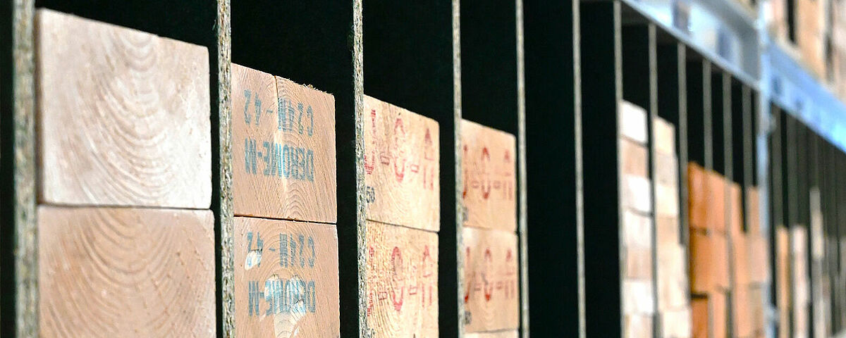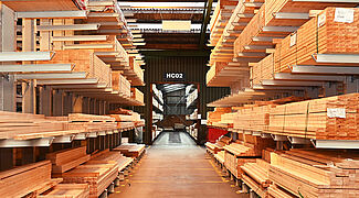 Para obtener una zona de almacenamiento continua, OHRA instaló placas de sujeción como suelos en los niveles de almacenamiento. Están divididos por placas de 18 milímetros de grosor que Brentjens montó él mismo. Así se crean compartimentos de diferentes anchos en los que se pueden introducir fácilmente listones y tablillas a lo largo. Cada compartimento está lleno de una sola tipología de artículo, por lo que el cliente puede reconocer directamente las diferentes secciones transversales y acceder rápidamente a la mercancía deseada. La parte superior de la estantería también se utiliza "clásicamente" como estantería para palés o compartimentos y ofrece espacio de almacenamiento adicional para una gran variedad de materiales.