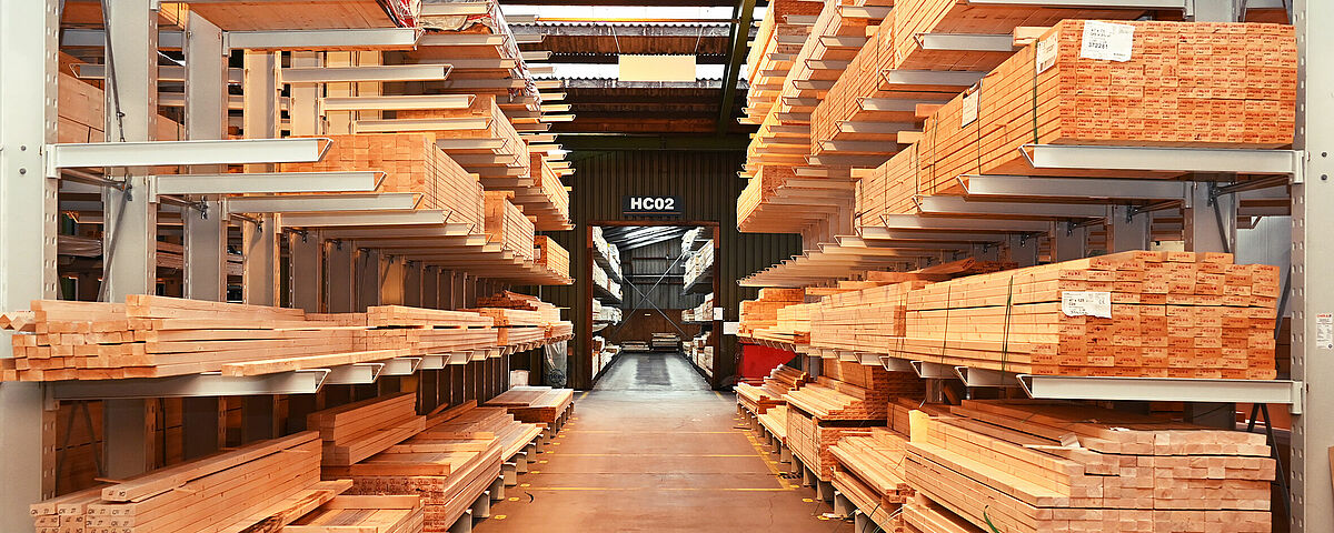 Para almacenar y presentar la multitud de listones y madera de construcción de forma clara para el cliente, Brentjens complementó las estanterías cantiléver con una "estantería enchufable" de 12 metros de ancho: Se trata de dos estanterías de paletización colocadas una detrás de otra, de casi 2,6 metros de altura. Sus dos bastidores, de 1 metro de profundidad cada uno, están sólidamente unidos entre sí por un separador también de 1 metro de longitud. Así se crea una estantería doble con una profundidad de 3 metros.