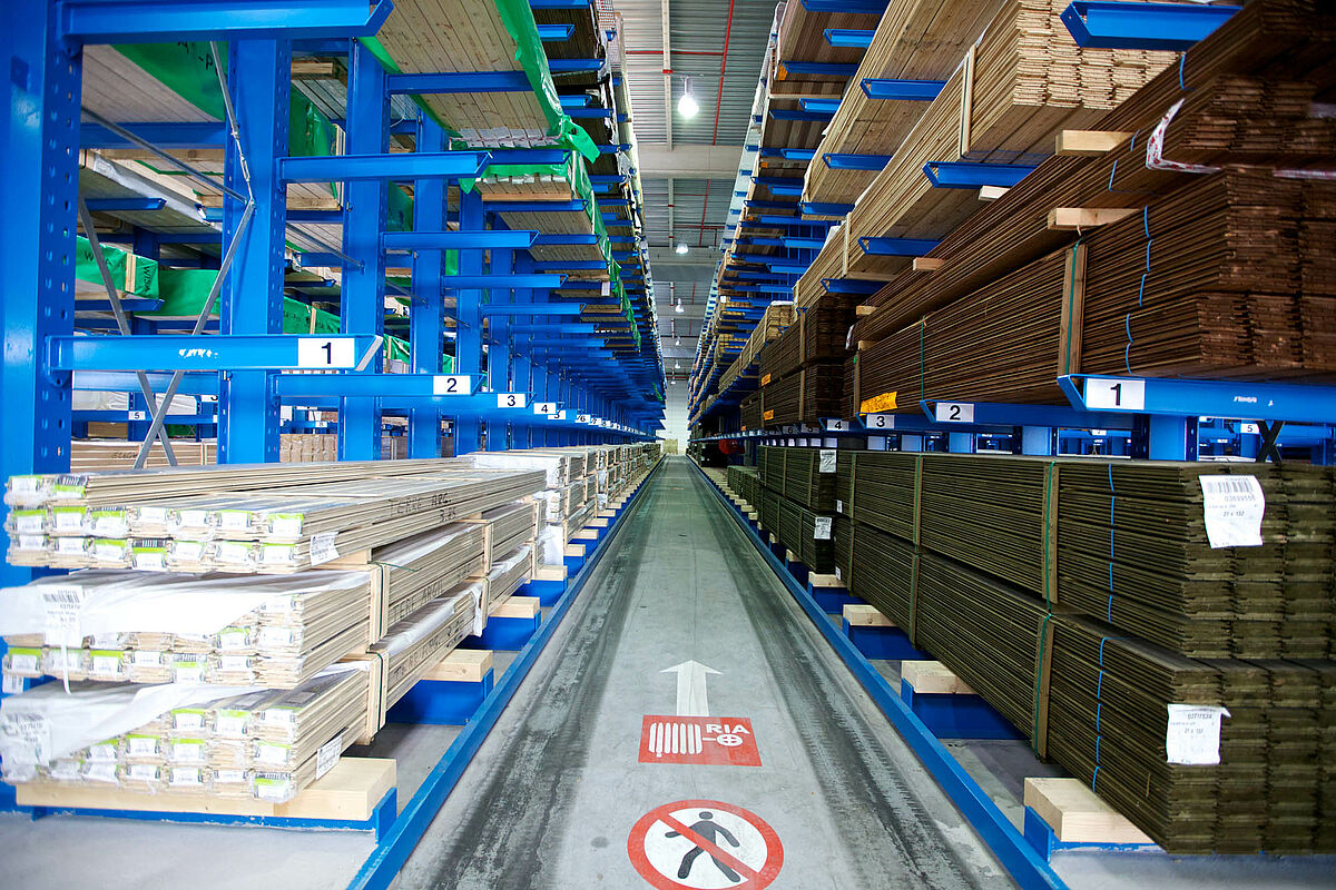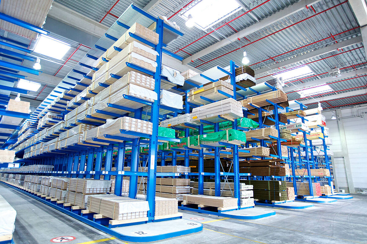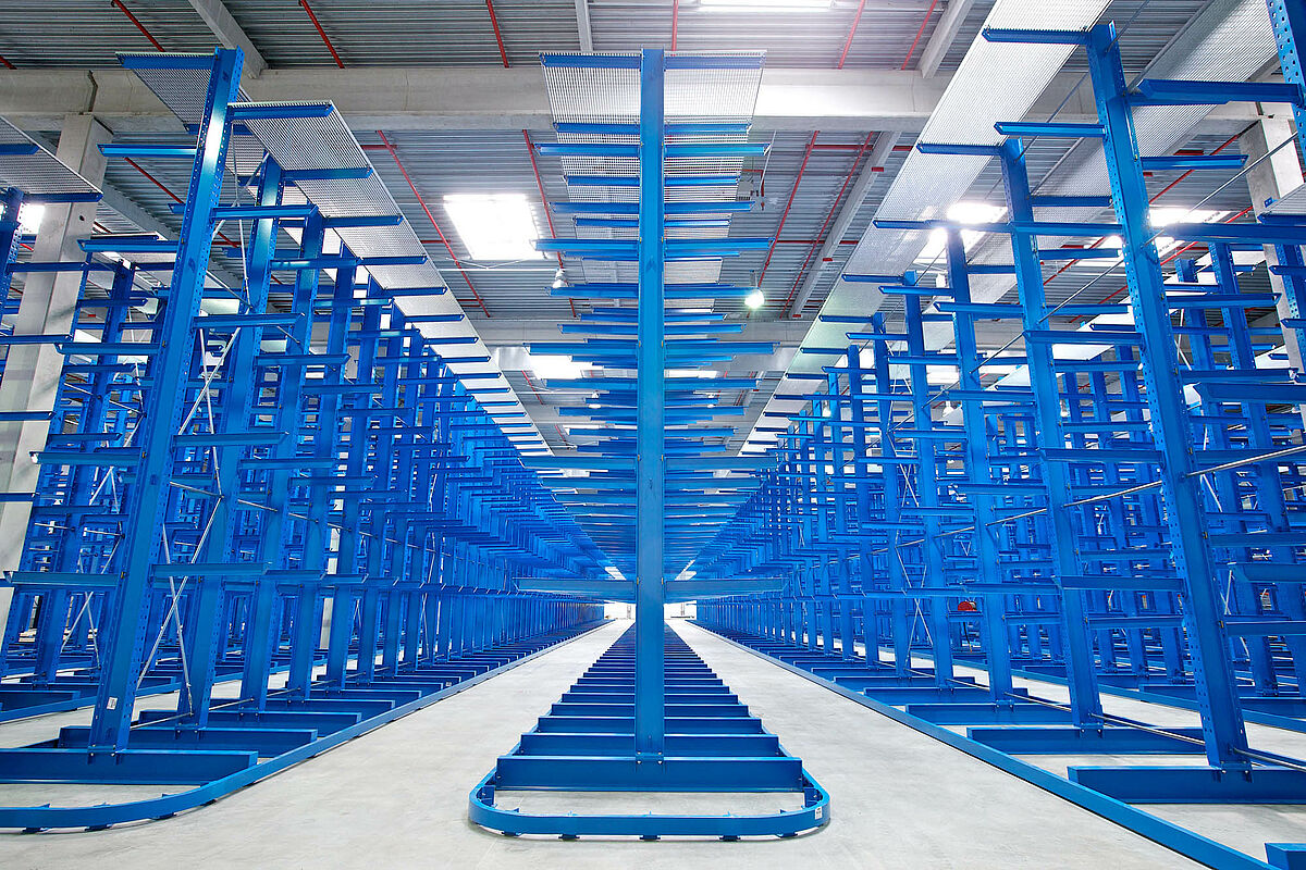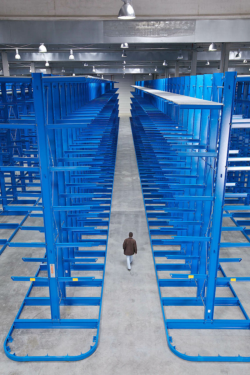 Así pues, según el concepto imaginado por el departamento técnico de la empresa de materiales de construcción, el proyecto preveía por un lado un sistema de estanterías cantiléver con 15 filas de 75 metros de longitud y 8 de altura cada una para el almacenamiento de mercancías de hasta 13 metros de longitud y por otra, otras 10 filas de estanterías de paletización de 8,5 metros de altura e igualmente 75 metros de longitud. En total se planificaron 22 pasillos, doce de los cuales estaba previsto ejecutar como estantería cantiléver de pasillo estrecho. Para la entrada y la salida de las mercancías se decidió utilizar carretillas elevadoras multidireccionales.