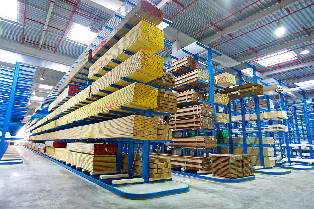 Pero la solución de estanterías propuesta por OHRA también convenció por sus detalles. Y es que en la fabricación de las estanterías cantiléver la empresa alemana utiliza exclusivamente acero normalizado de alma llena laminado en caliente. A diferencia de la chapa, este material conserva permanentemente sus propiedades estáticas, incluso en el caso de que las condiciones de trabajo en el almacén sean extremadamente duras. Al transportar los productos durante su entrada o salida del almacén, los choques con los brazos en voladizo pueden dañar las mercancías, en especial en el caso de tableros que sobresalen. Por este motivo, para proteger la mercancía que se deposita en el almacén y las propias estanterías, OHRA utiliza brazos en voladizo autoprotectores enganchados, los cuales cuando se empujan se apartan hacia arriba y lateralmente, lo que evita que la mercancía o la estantería resulten dañadas.