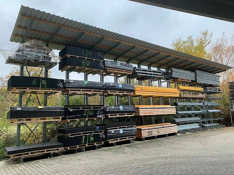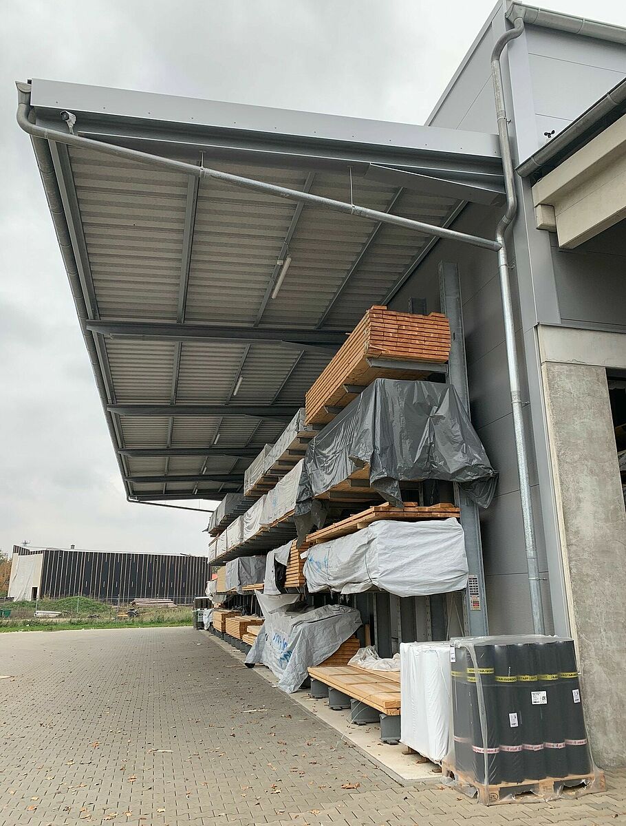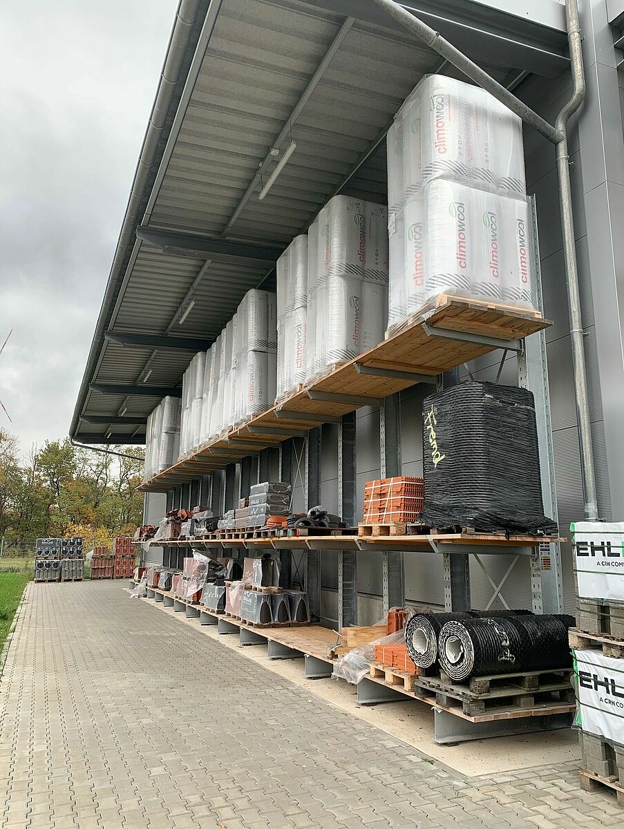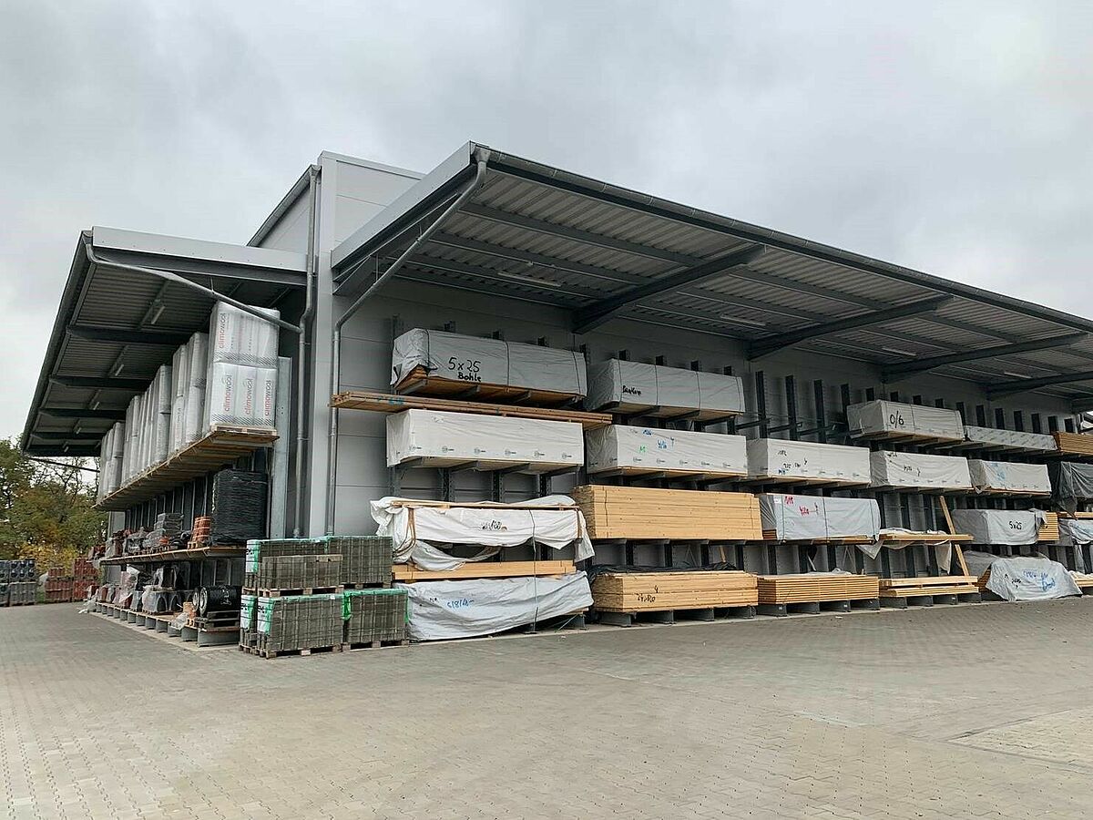 La nueva nave del almacén de 12 m de altura se construyó sobre una superficie de 1000 metros cuadrados y ofrece un lugar adicional para artículos nuevos como paneles de fachadas, placas insonorizantes o maderos macizos para la construcción.  Muchos de los artículos guardados y protegidos ahora en las estanterías se almacenaban antes en exteriores o en el piso. Así, usando las estanterías de paletas de hasta 6,58 m de alto y las estanterías cantiléver de unos 7 m de alto, se pudo ampliar tanto la capacidad de almacenamiento como mejorar notablemente el acceso a la mercadería. En total OHRA instaló cuatro filas de estanterías de unos 18 metros, compuestas por estanterías cantiléver y de paletas, y también se colocaron a lo largo de las paredes interiores de la nave dos estanterías cantiléver de 25,5 m de largo con seis niveles de almacenamiento. Otras estanterías cantiléver se usan en el exterior para materiales de construcción resistentes a la intemperie.