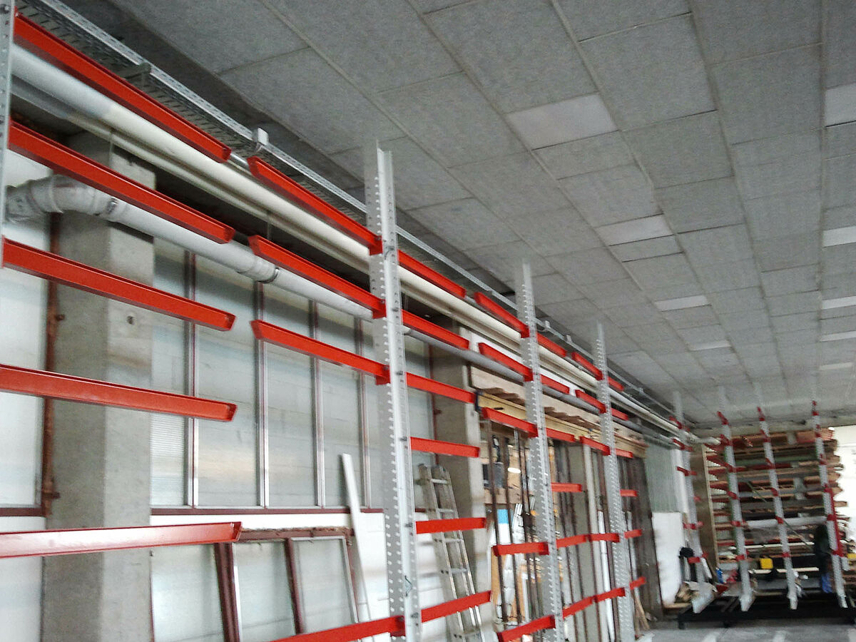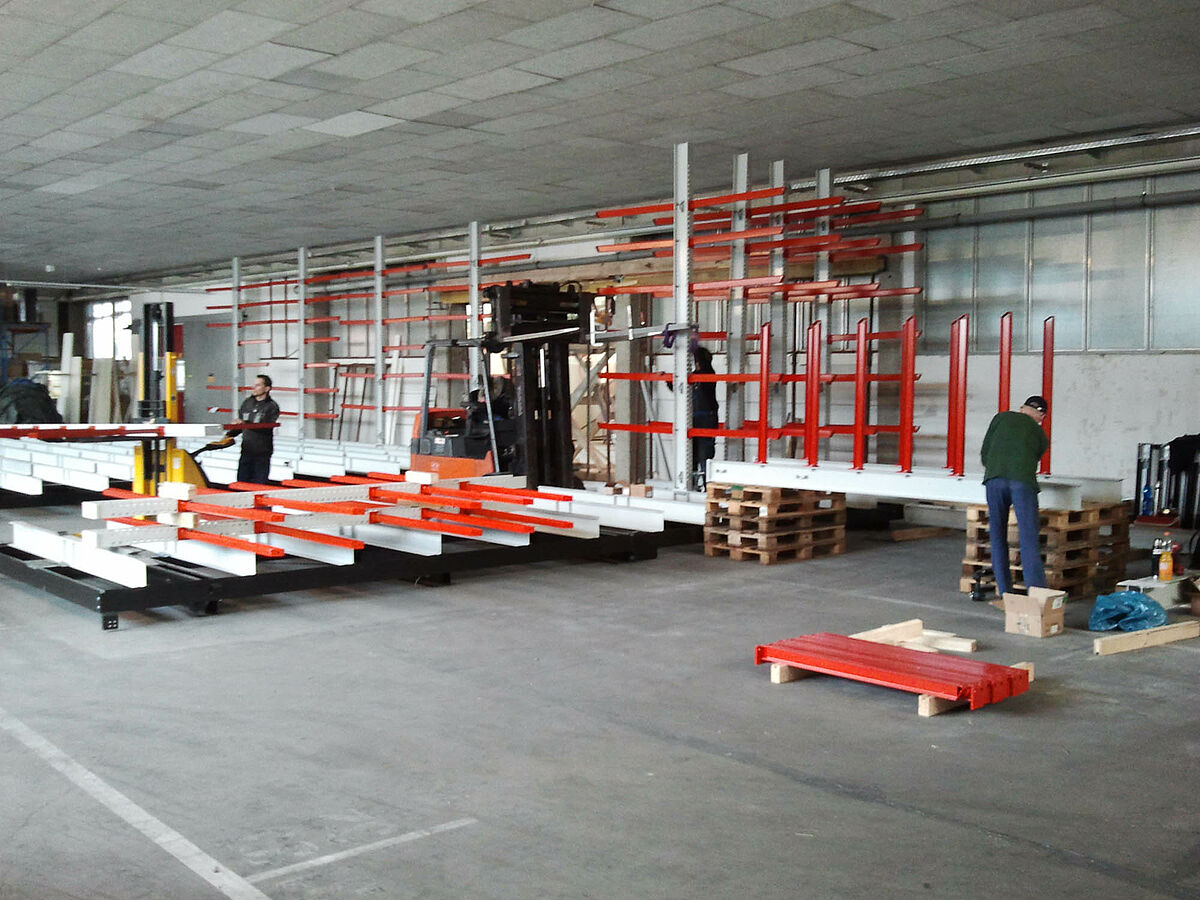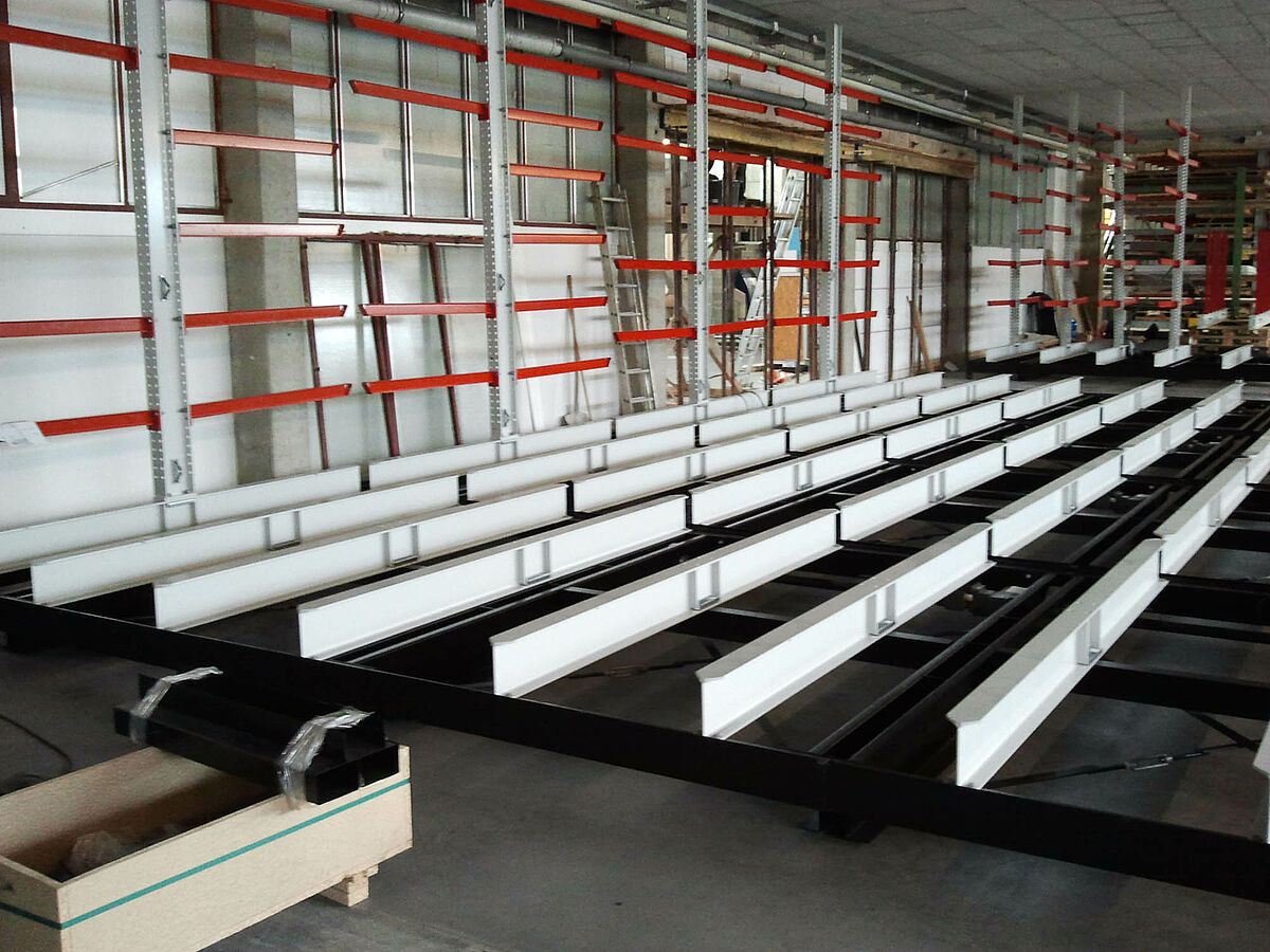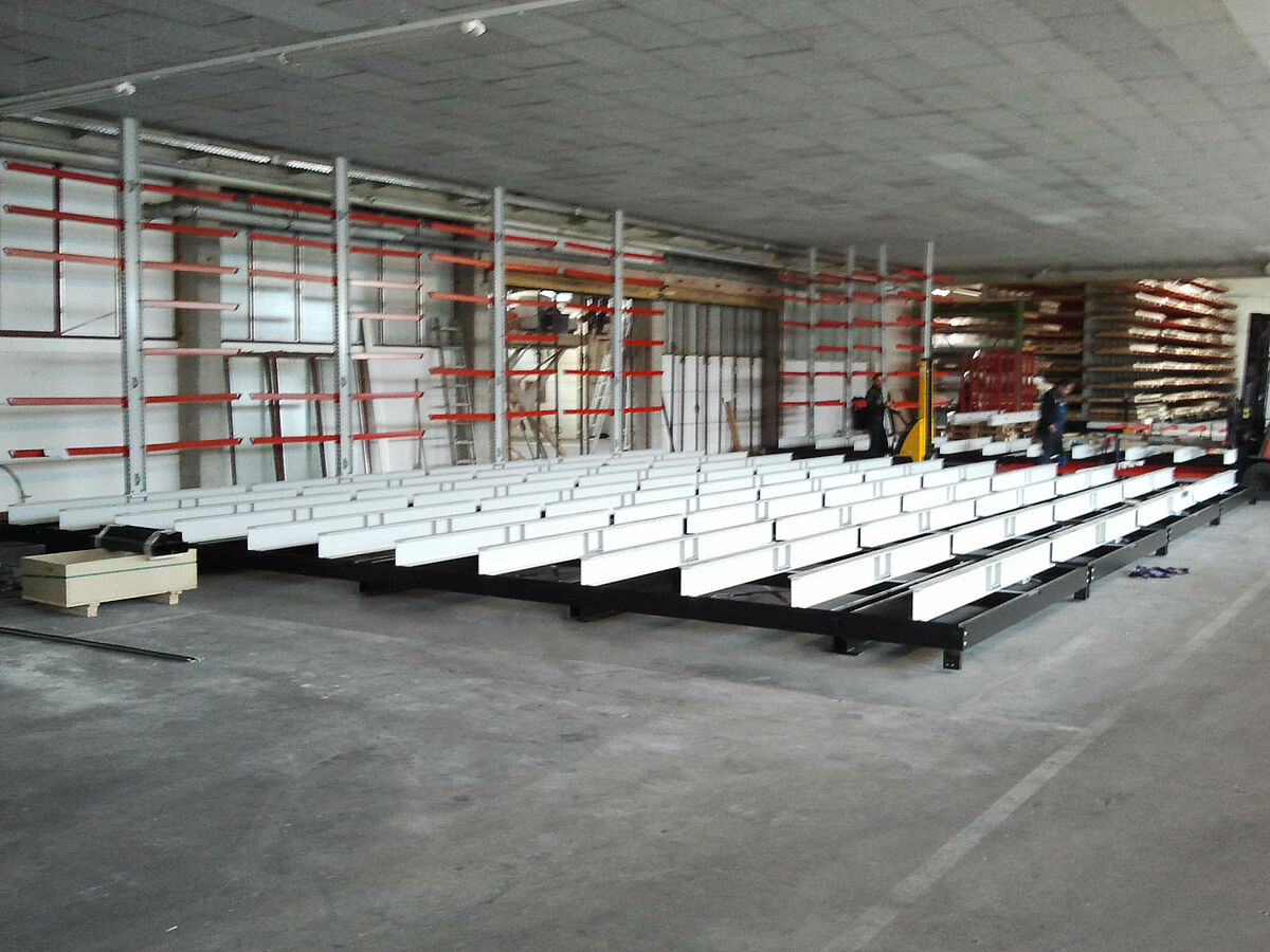 erform encontró esta solución en la empresa OHRA. La empresa especialista en estanterías cantiléver con sede en Colonia ofrece un sistema en el cual las estanterías se montan sobre carros desplazables. Estas estanterías desplazables disponen de casi 100 por 100 más capacidad de almacenamiento que las estanterías comunes montadas fijas. En erform los expertos de la empresa OHRA montaron un sistema con cinco estanterías cantiléver bilaterales de 9 metros de largo. Se instalaron siete niveles de estanterías con una altura de 4.080 milímetros. Además de estas estanterías montadas sobre carros desplazables una estantería unilateral fija ofrece más superficie para almacenamiento.