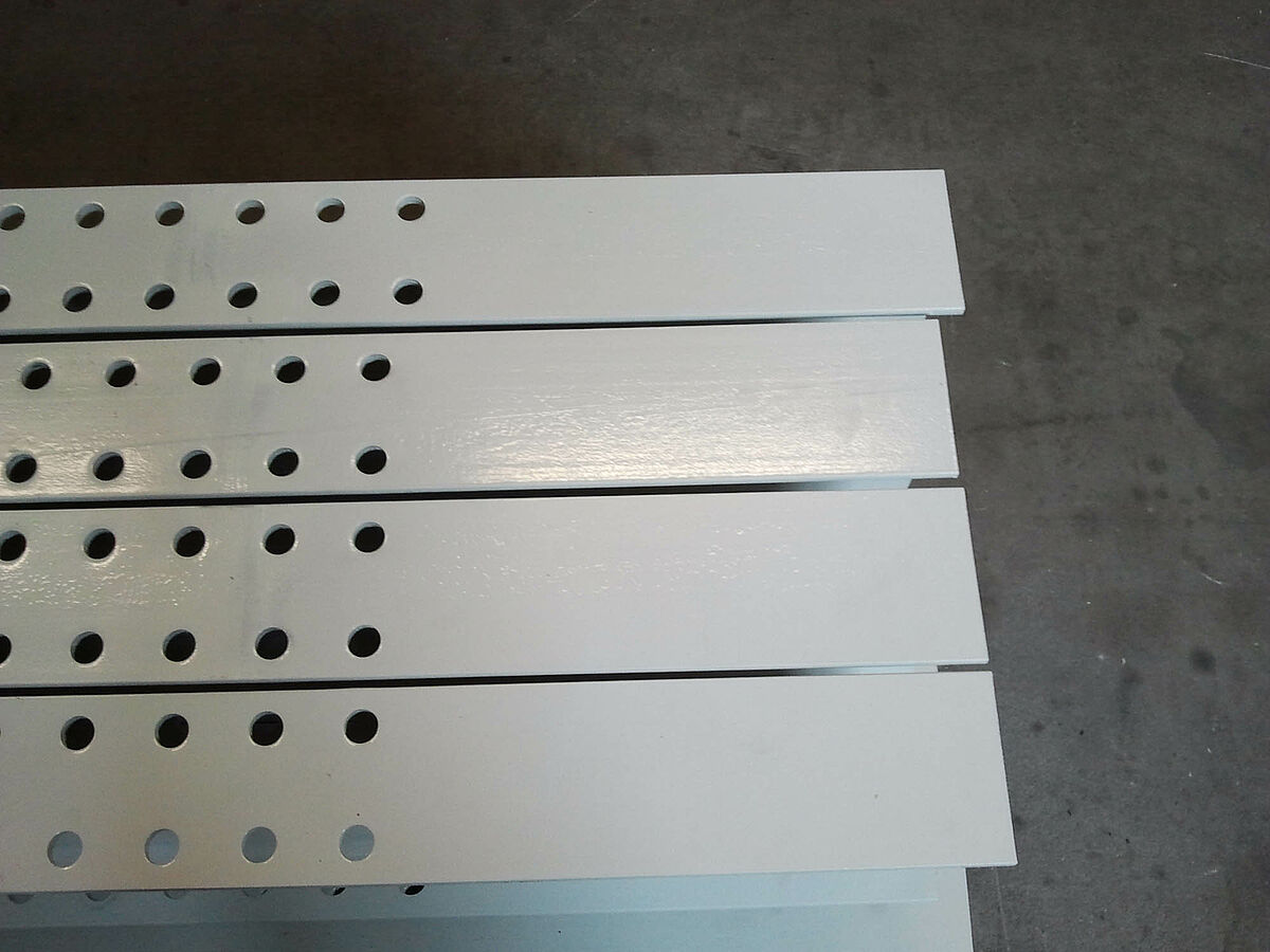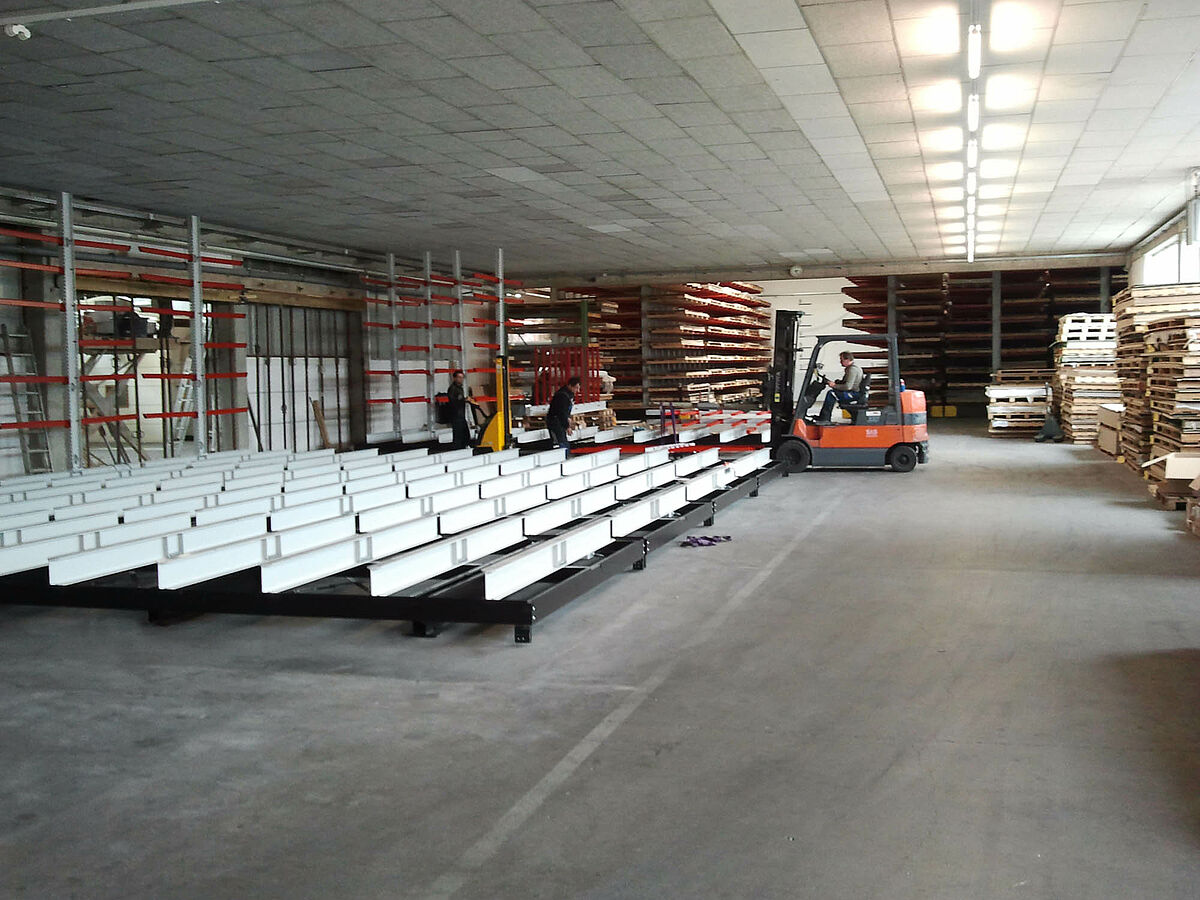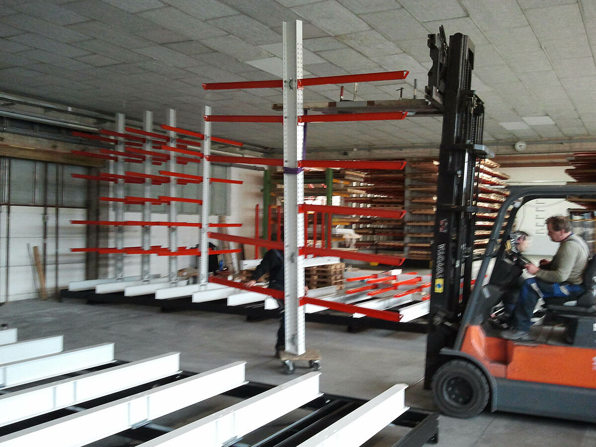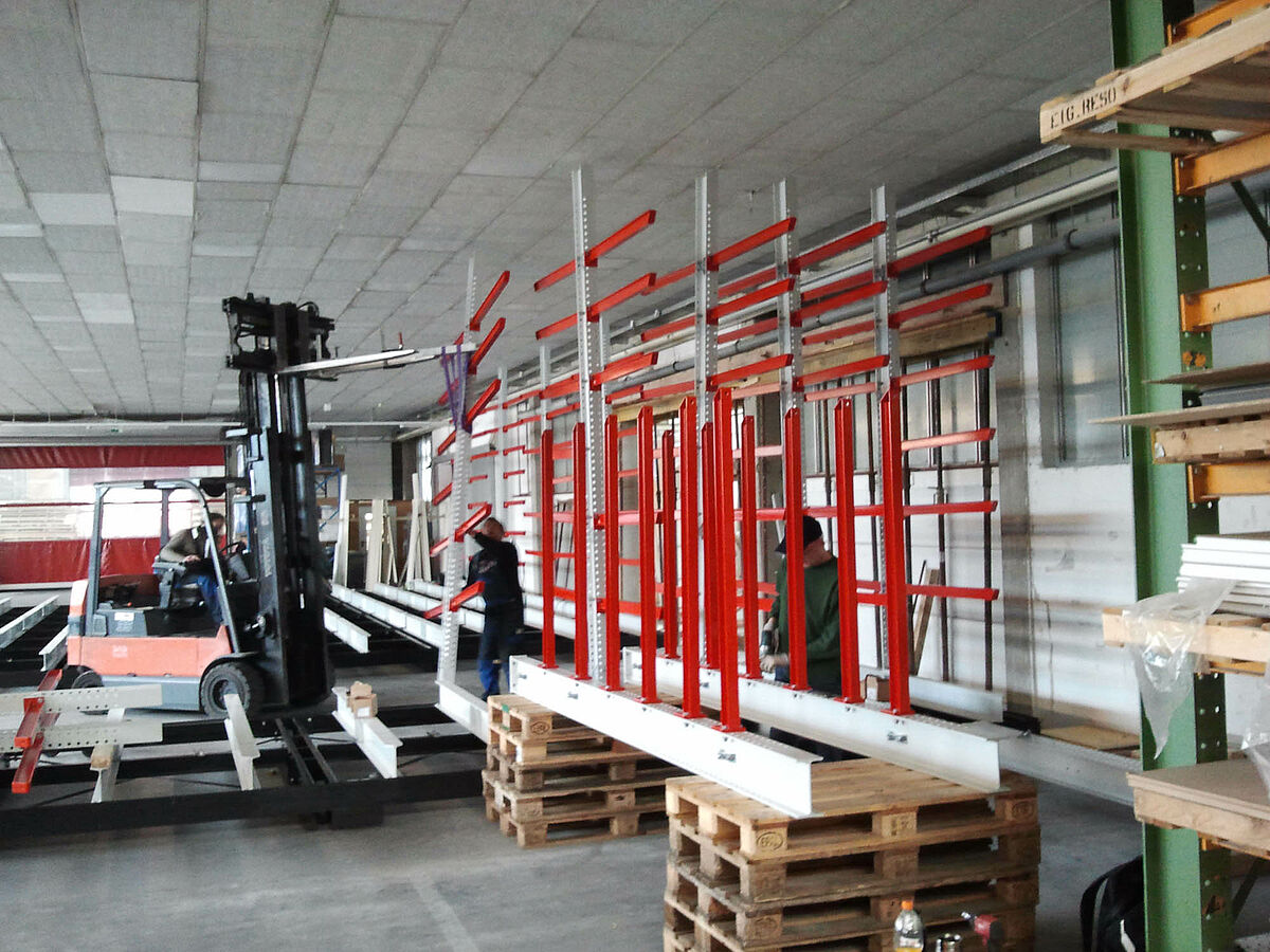 erform encontró esta solución en la empresa OHRA. La empresa especialista en estanterías cantiléver con sede en Colonia ofrece un sistema en el cual las estanterías se montan sobre carros desplazables. Estas estanterías desplazables disponen de casi 100 por 100 más capacidad de almacenamiento que las estanterías comunes montadas fijas. En erform los expertos de la empresa OHRA montaron un sistema con cinco estanterías cantiléver bilaterales de 9 metros de largo. Se instalaron siete niveles de estanterías con una altura de 4.080 milímetros. Además de estas estanterías montadas sobre carros desplazables una estantería unilateral fija ofrece más superficie para almacenamiento.