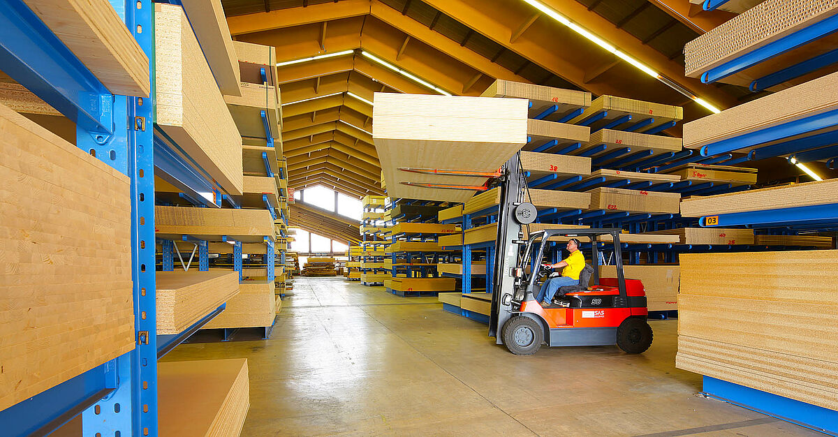 En el nuevo centro de distribución de Gitsche se almacenan chapas, productos y tableros de madera y materiales en forma de placa en tamaños de 250 x 125 hasta 560 x 210 centímetros. Esta empresa ya había sustituido las estanterías existentes en su sede social por estanterías cantiléver de OHRA. Convencida por la gran calidad de las estanterías fabricadas en acero normalizado laminado en caliente, eligió también las estanterías de OHRA para equipar el nuevo centro de distribución.