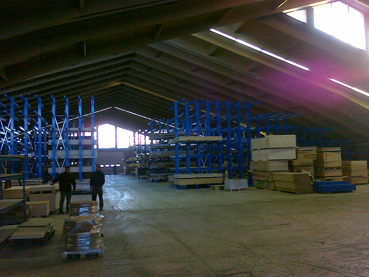 Pero en este caso tuvo que tenerse en cuenta una particularidad: el nuevo almacén se integró en una nave ya existente con una cubierta a dos aguas con una pendiente bastante pronunciada. Sin embargo, gracias a la estructura modular de las estanterías cantiléver de OHRA, la altura disponible pudo aprovechase de forma óptima: en la pared exterior de la nave, la altura de las estanterías es de tres metros y va incrementándose paulatinamente hasta alcanzar los seis metros en el centro del edificio. En la parte con mayor altura, las estanterías disponen de siete niveles de almacenamiento. En los aproximadamente 800 espacios de almacenamiento se trabaja con carretillas elevadoras electrónicas.