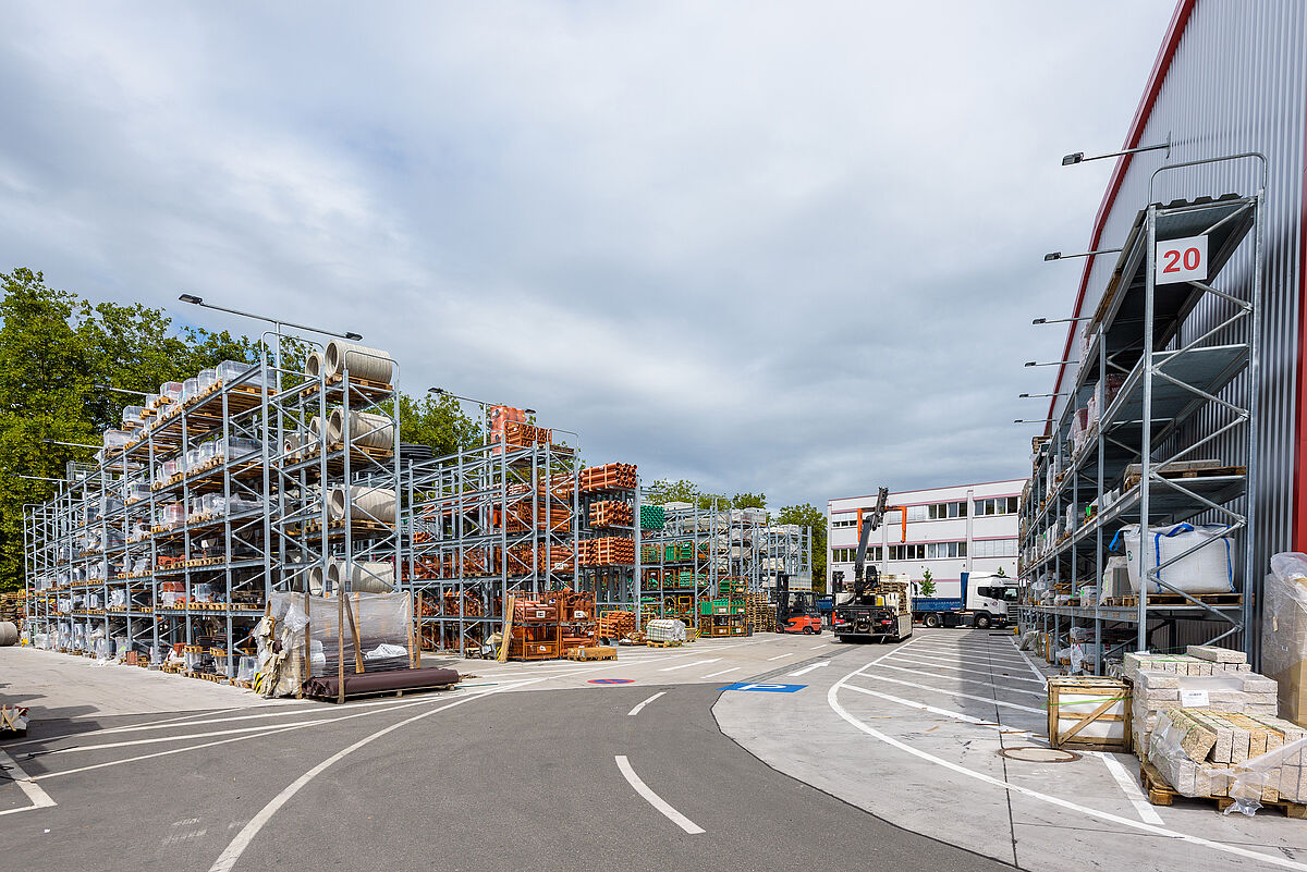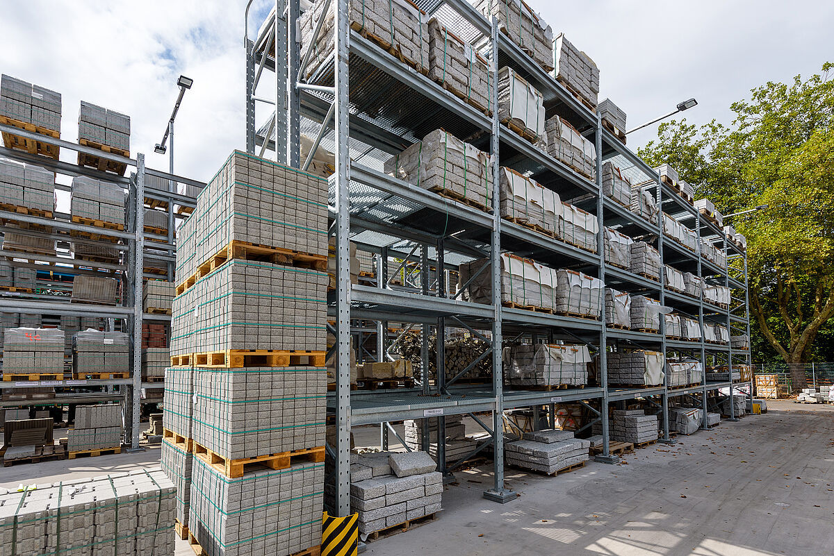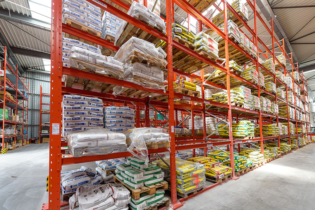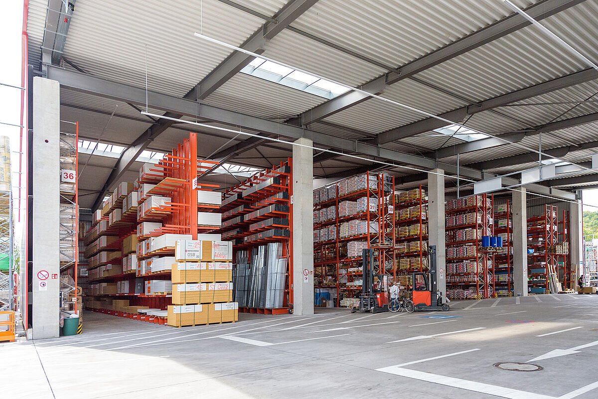 Götz + Moriz, líder del mercado en el comercio de materiales de construcción y baldosas en el sur de Baden, ha ampliado considerablemente sus instalaciones de Lörrach. La empresa invirtió sobre todo en grandes superficies de almacenamiento y en un nuevo almacén equipado con estanterías de paletización y estanterías cantilever OHRA. Sin embargo, su ubicación planteó retos especiales para la construcción de las estanterías: Algunas estanterías tuvieron que construirse a lo largo de una pendiente, mientras otras tuvieron que calcularse en función de la fuerza del viento y se tuvo en cuenta para todas ellas la zona sísmica 3. De todos modos, gracias a la construcción estable de las estanterías OHRA, se pudieron alcanzar alturas de bastidor de hasta 9.100 milímetros, con cargas por módulo de 25.200 kilogramos y cargas de estanterías de 5.000 kilogramos.