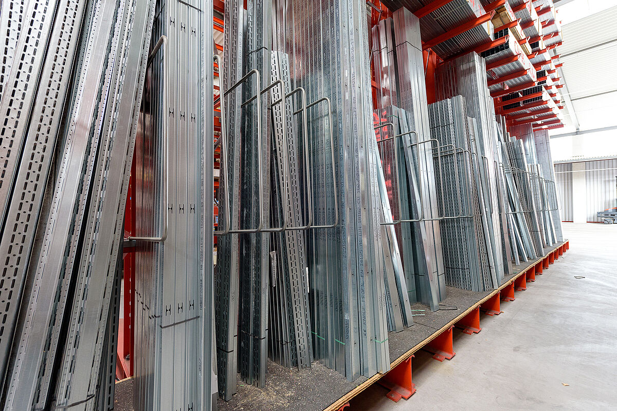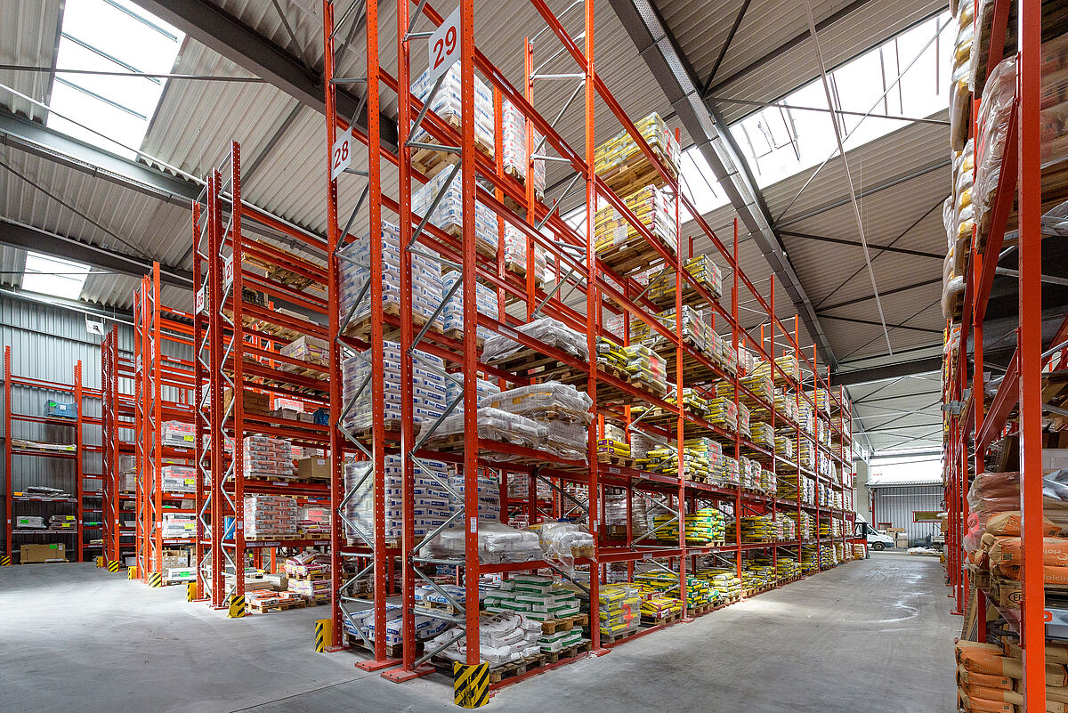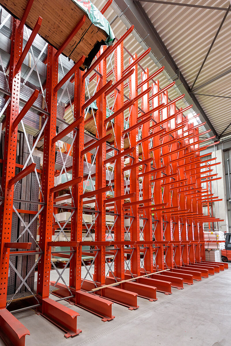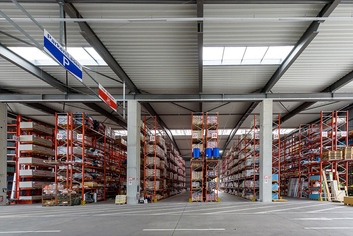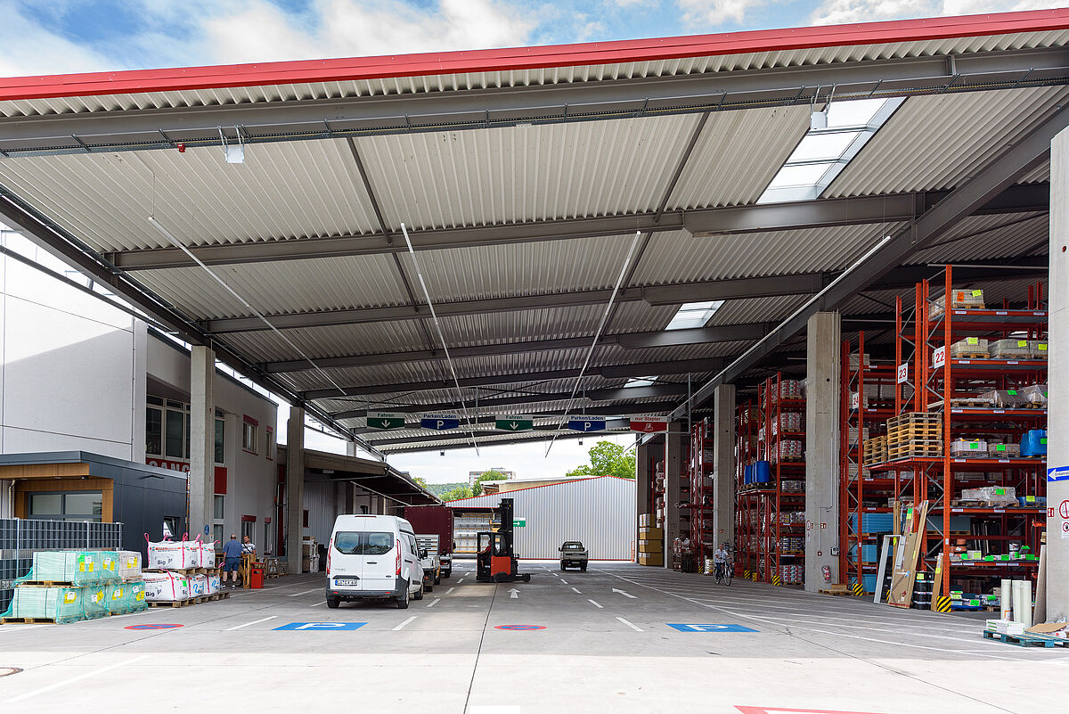 Götz + Moriz, líder del mercado en el comercio de materiales de construcción y baldosas en el sur de Baden, ha ampliado considerablemente sus instalaciones de Lörrach. La empresa invirtió sobre todo en grandes superficies de almacenamiento y en un nuevo almacén equipado con estanterías de paletización y estanterías cantilever OHRA. Sin embargo, su ubicación planteó retos especiales para la construcción de las estanterías: Algunas estanterías tuvieron que construirse a lo largo de una pendiente, mientras otras tuvieron que calcularse en función de la fuerza del viento y se tuvo en cuenta para todas ellas la zona sísmica 3. De todos modos, gracias a la construcción estable de las estanterías OHRA, se pudieron alcanzar alturas de bastidor de hasta 9.100 milímetros, con cargas por módulo de 25.200 kilogramos y cargas de estanterías de 5.000 kilogramos.