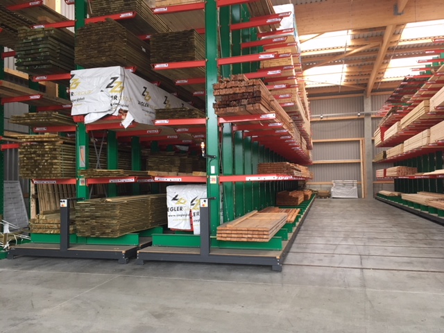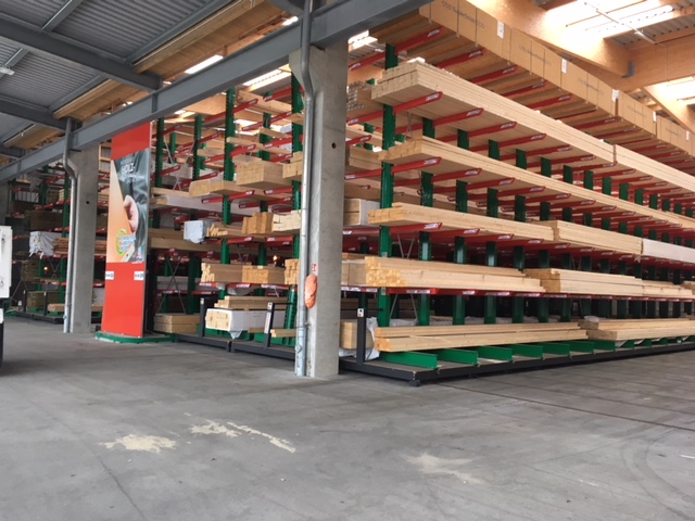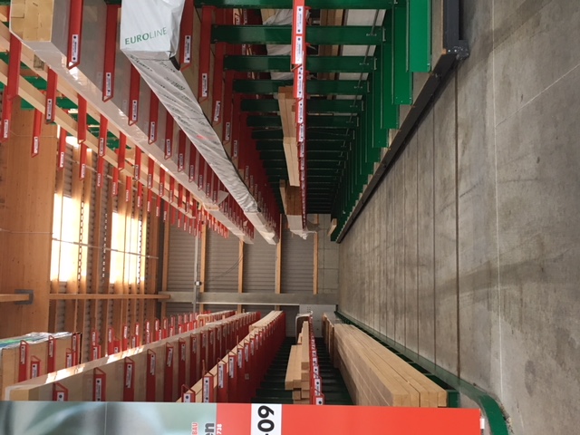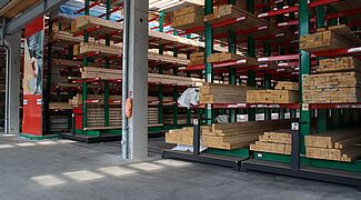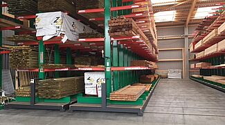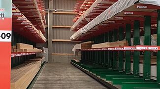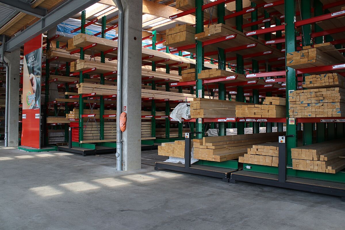 En este almacén se entregan los pedidos de materiales de construcción de artesanos y constructores privados. Entre los artículos almacenados hay varios materiales de construcción, maderas de hasta 13 metros de largo y diversos artículos en bolsas. El enfoque principal de la modernización fue aumentar la capacidad de almacenamiento con el fin de poder ofrecer a los clientes una cartera más amplia de productos. Hasta el momento, los artículos se almacenaban exclusivamente en varios lineales de estanterías cantiléver.