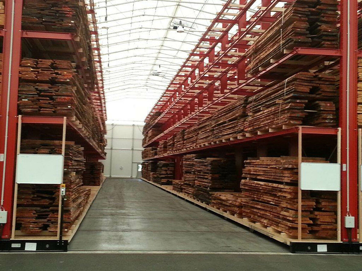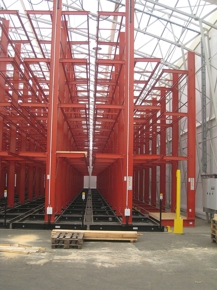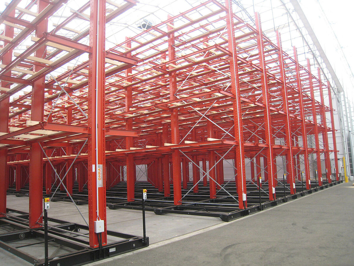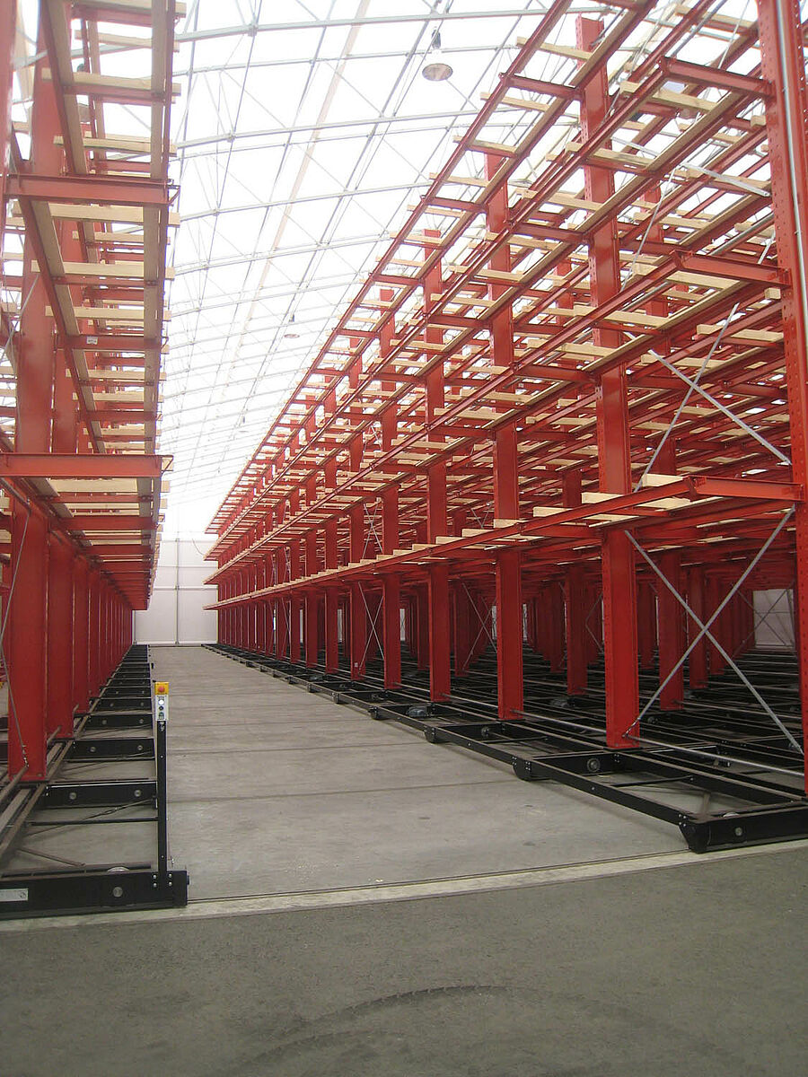 OHRA se hizo cargo de la ejecución de todo el sistema de estanterías. Esto incluyó también el montaje de los carriles necesarios para los carros móviles, los cuales antes de construir la nave en sí se encontraban a la intemperie. De un total de diez estanterías cantiléver de 60 metros de longitud y una altura máxima de 9,2 metros con cuatro y hasta cinco niveles, dos se atornillaron fijamente al suelo. Las ocho restantes se montaron sobre carros móviles de OHRA de 58 metros de longitud. Los carros móviles se accionan eléctricamente y se pueden desplazar desde la carretilla con un mando a distancia. Solo se abre el pasillo al que se quiere acceder, lo que permite duplicar la capacidad de almacenamiento en la superficie disponible.