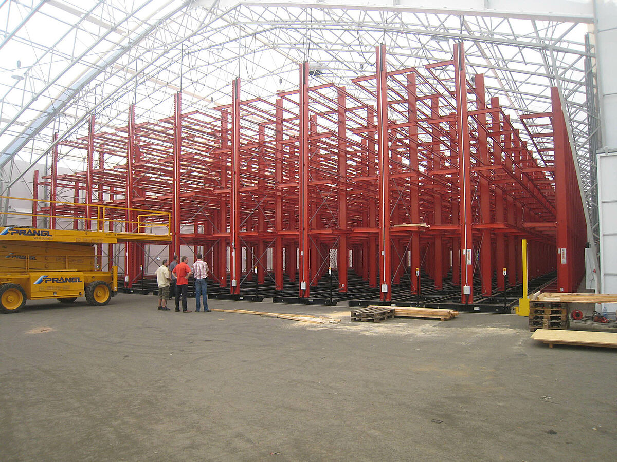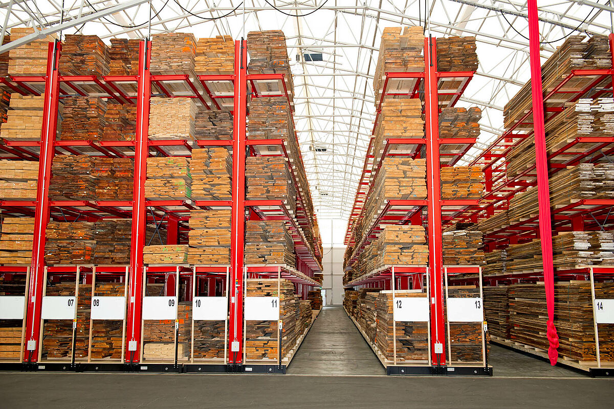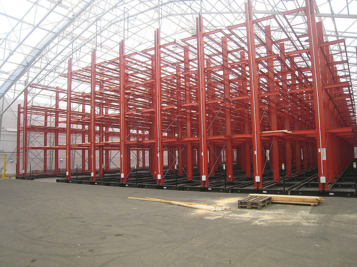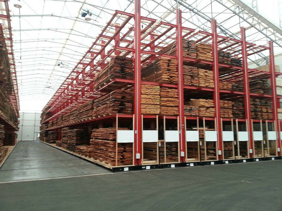 OHRA se hizo cargo de la ejecución de todo el sistema de estanterías. Esto incluyó también el montaje de los carriles necesarios para los carros móviles, los cuales antes de construir la nave en sí se encontraban a la intemperie. De un total de diez estanterías cantiléver de 60 metros de longitud y una altura máxima de 9,2 metros con cuatro y hasta cinco niveles, dos se atornillaron fijamente al suelo. Las ocho restantes se montaron sobre carros móviles de OHRA de 58 metros de longitud. Los carros móviles se accionan eléctricamente y se pueden desplazar desde la carretilla con un mando a distancia. Solo se abre el pasillo al que se quiere acceder, lo que permite duplicar la capacidad de almacenamiento en la superficie disponible.