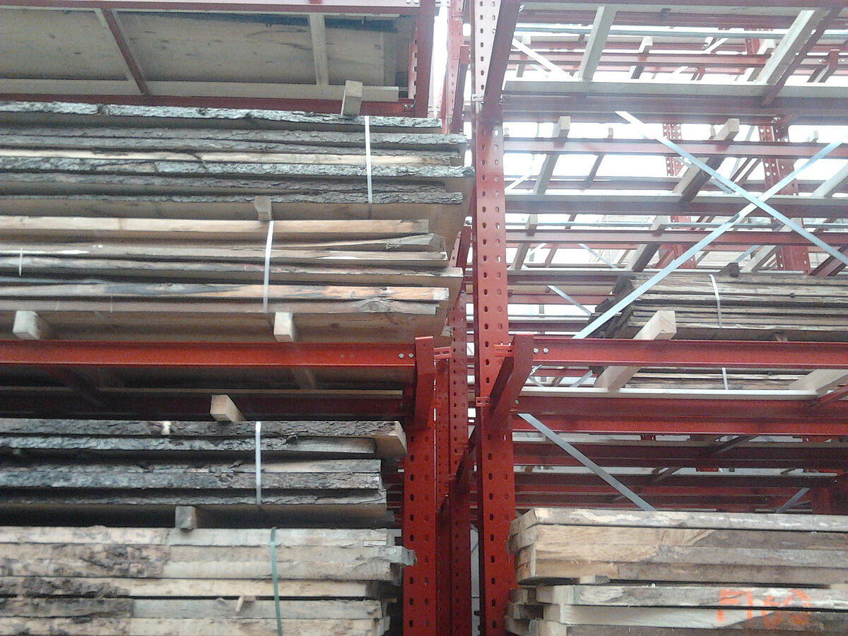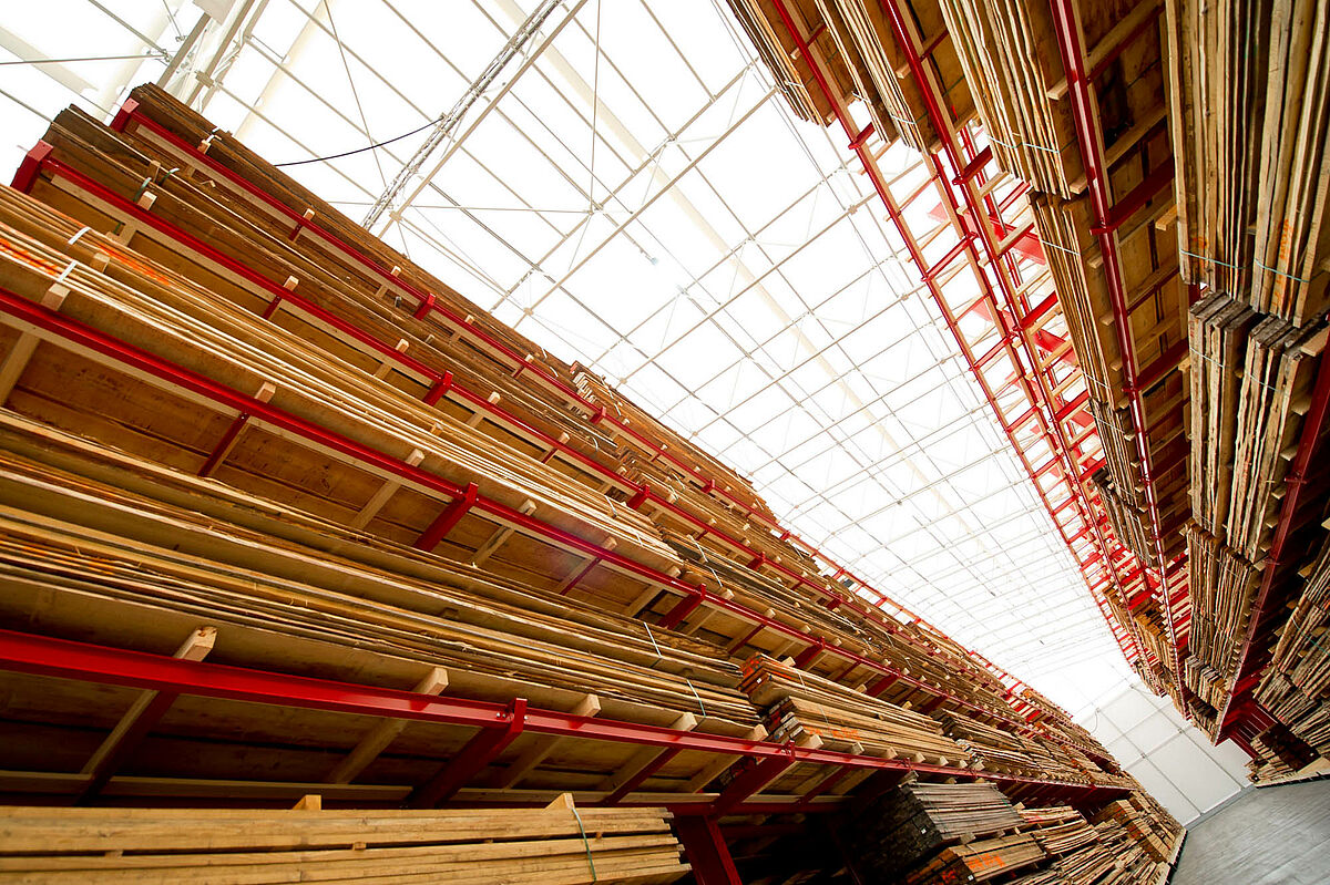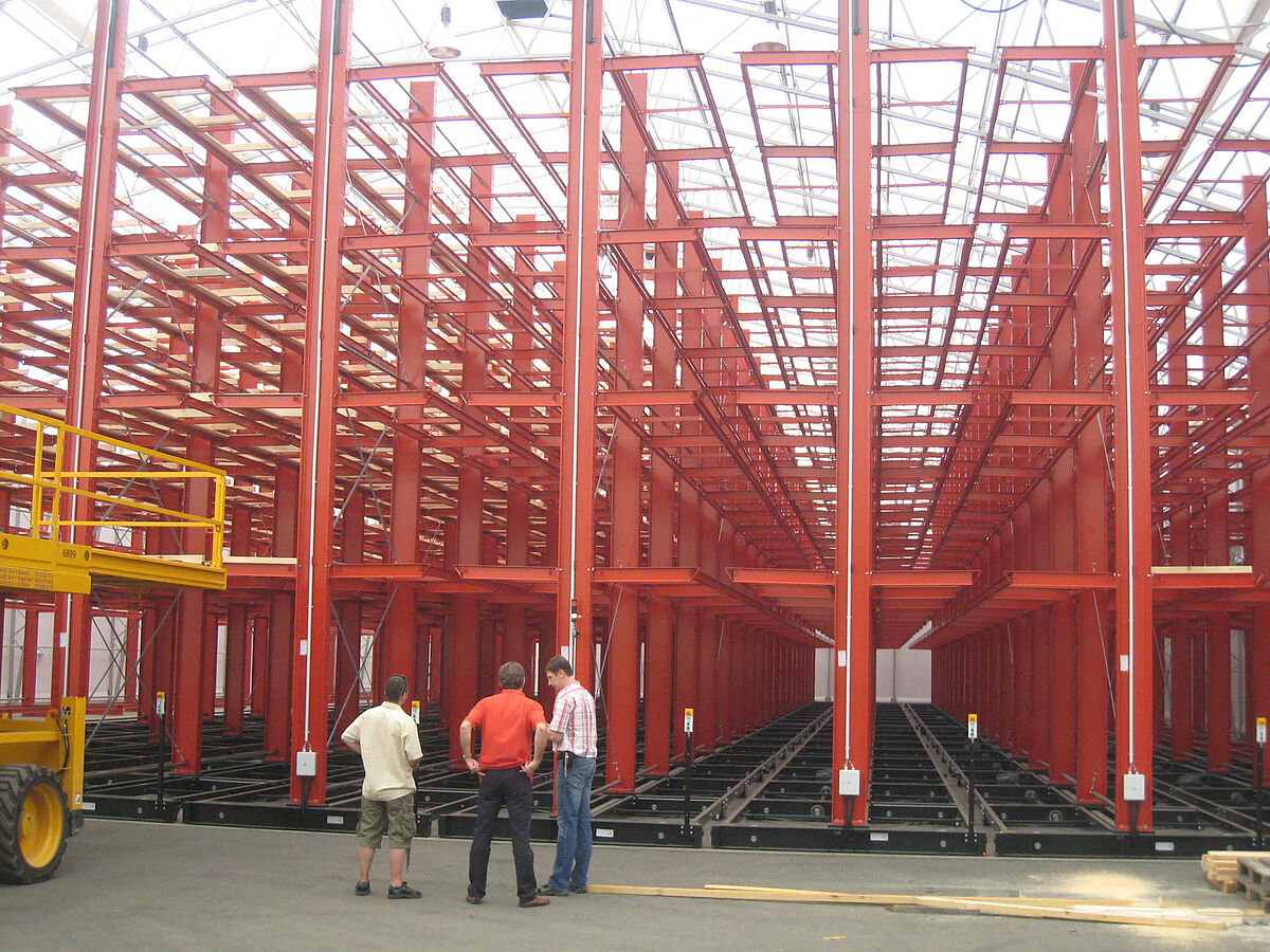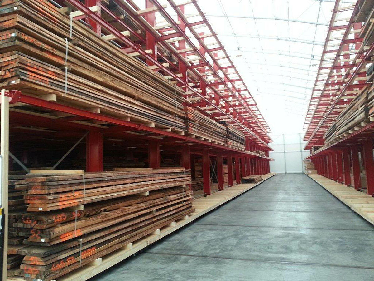 OHRA se hizo cargo de la ejecución de todo el sistema de estanterías. Esto incluyó también el montaje de los carriles necesarios para los carros móviles, los cuales antes de construir la nave en sí se encontraban a la intemperie. De un total de diez estanterías cantiléver de 60 metros de longitud y una altura máxima de 9,2 metros con cuatro y hasta cinco niveles, dos se atornillaron fijamente al suelo. Las ocho restantes se montaron sobre carros móviles de OHRA de 58 metros de longitud. Los carros móviles se accionan eléctricamente y se pueden desplazar desde la carretilla con un mando a distancia. Solo se abre el pasillo al que se quiere acceder, lo que permite duplicar la capacidad de almacenamiento en la superficie disponible.