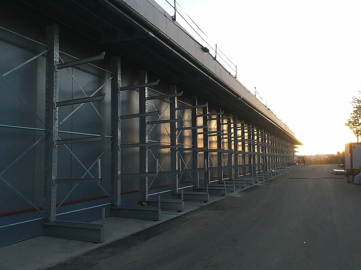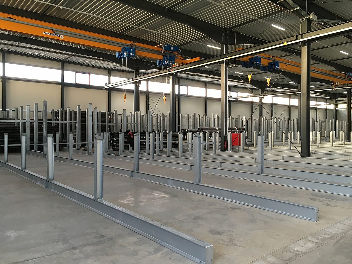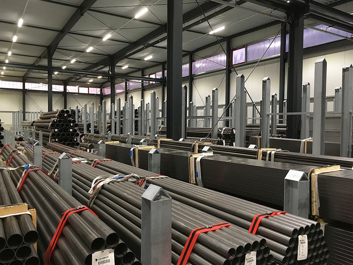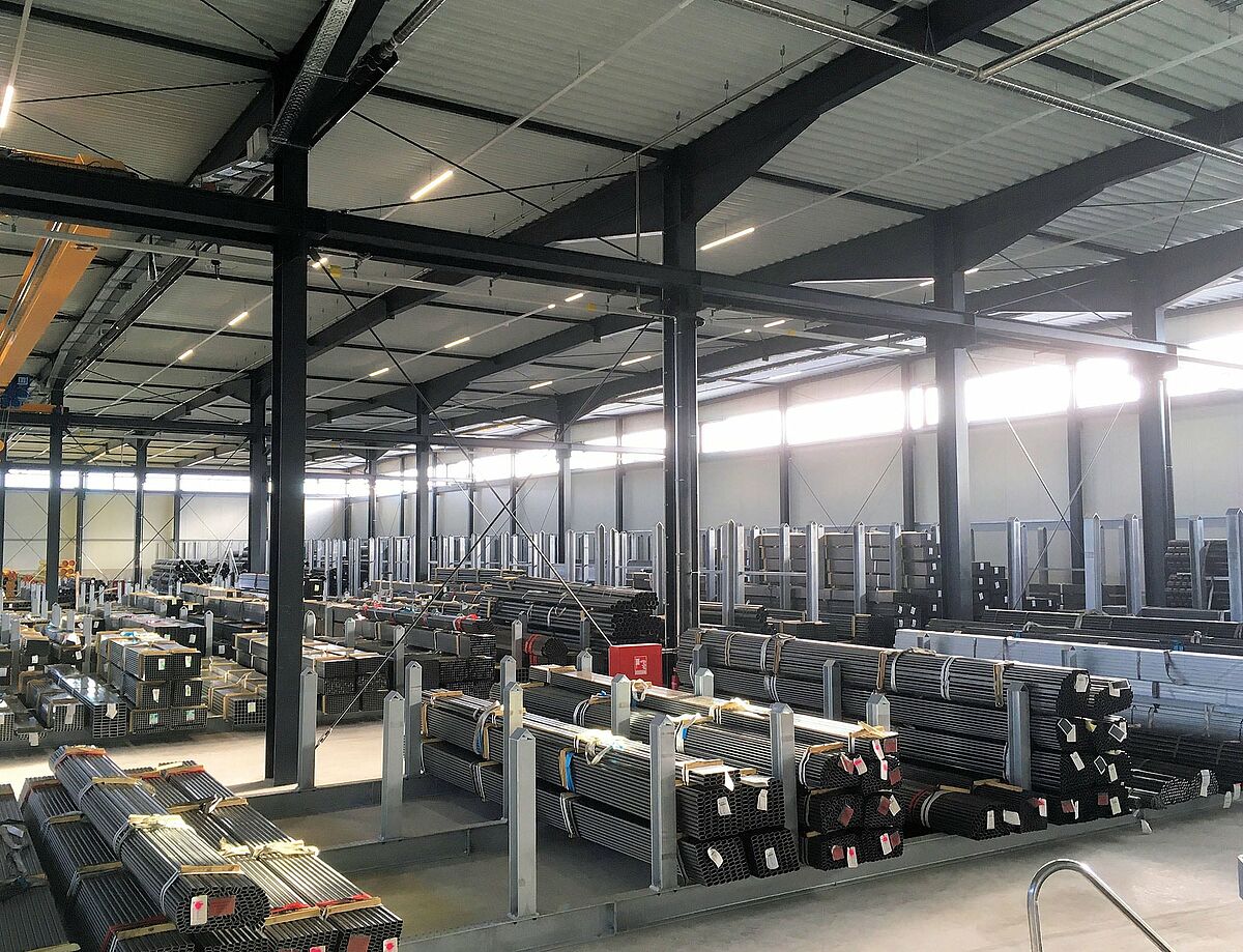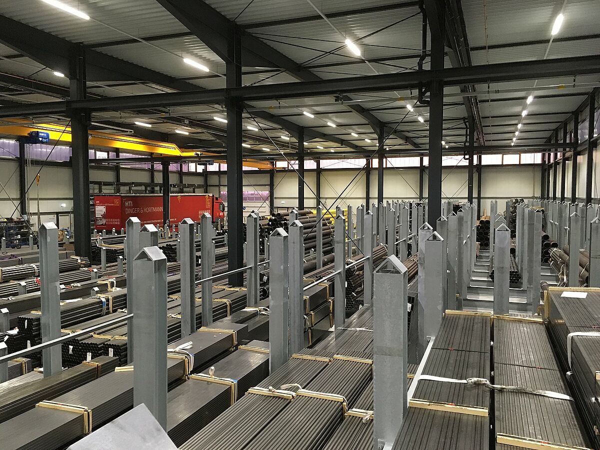 Mientras que los tubos pesados y largos o los paquetes de tubos se almacenan en las estanterías en plano, los tubos ligeros se almacenan en las estanterías cantiléver de OHRA. Las estanterías galvanizadas de aproximadamente 5 metros de altura se instalaron en las paredes interiores de la nave por un lado y en las paredes exteriores por el otro. Los adaptadores de brazo de 1,4 metros de largo, pueden soportar hasta 640 kilogramos, asegurando que los tubos se almacenen de forma segura.