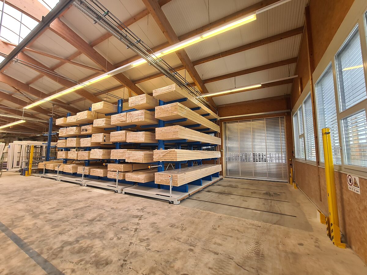 El sistema se maneja por medio de dos radiocontroles o manualmente en el vagón de transporte. Dado que el recorrido de las estanterías, de más de 16 metros de longitud, atraviesa un pasillo hacia una nave vecina, se instaló un botón adicional en la puerta de la nave con el que se puede abrir el pasillo de estanterías correspondiente. Además, el sistema de control se programó para que las estanterías salieran automáticamente del pasillo después de diez minutos sin actividad. El sistema de control de las estanterías también permite controlar un total de cuatro puertas de pasillo, por lo que el conductor de la carretilla sólo necesita un mando a distancia con el que puede manejar tanto las estanterías como las puertas. Las estanterías también se pueden mover a una posición de recogida a través del sistema de control: Los cinco pasillos entre las estanterías están abiertos para poder retirar la madera a mano.
