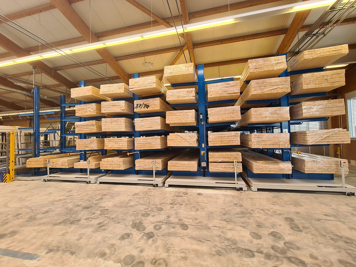 Un nuevo sistema de estanterías móviles de OHRA ha permitido a J. Stocker Fensterbau AG ampliar considerablemente su capacidad de almacenamiento de madera sin necesidad de utilizar mucho espacio adicional. Cuatro estanterías cantiléver de doble cara montadas en vagones de transporte permiten ganar espacio de almacenamiento y, al mismo tiempo, ahorrar en las rutas de transporte. El sistema se controla por radio, por ejemplo, desde el montacargas o a manualmente, desde los vagones de transporte. El control por radio también permite funciones especiales como la colocación de las estanterías para la recogida manual o la liberación automática del paso a la puerta de una sala después de cierto tiempo sin actividad. Además, se amplió el control remoto del sistema para que también pueda utilizarse para operar cuatro puertas de pasillo.