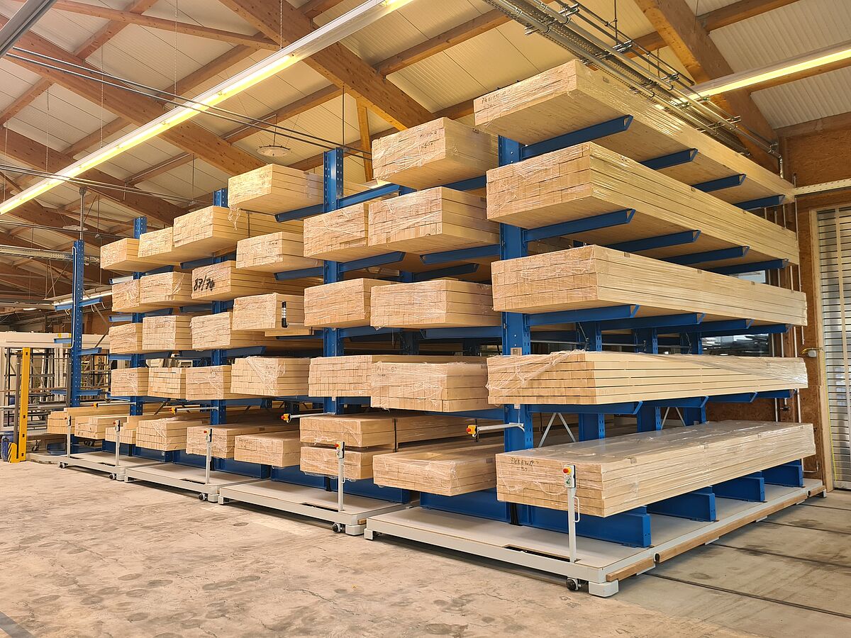 El sistema de estanterías puesto en marcha en agosto de 2020 brinda el aumento necesario de la capacidad de almacenamiento y una extracción de madera mucho más eficiente y práctica.