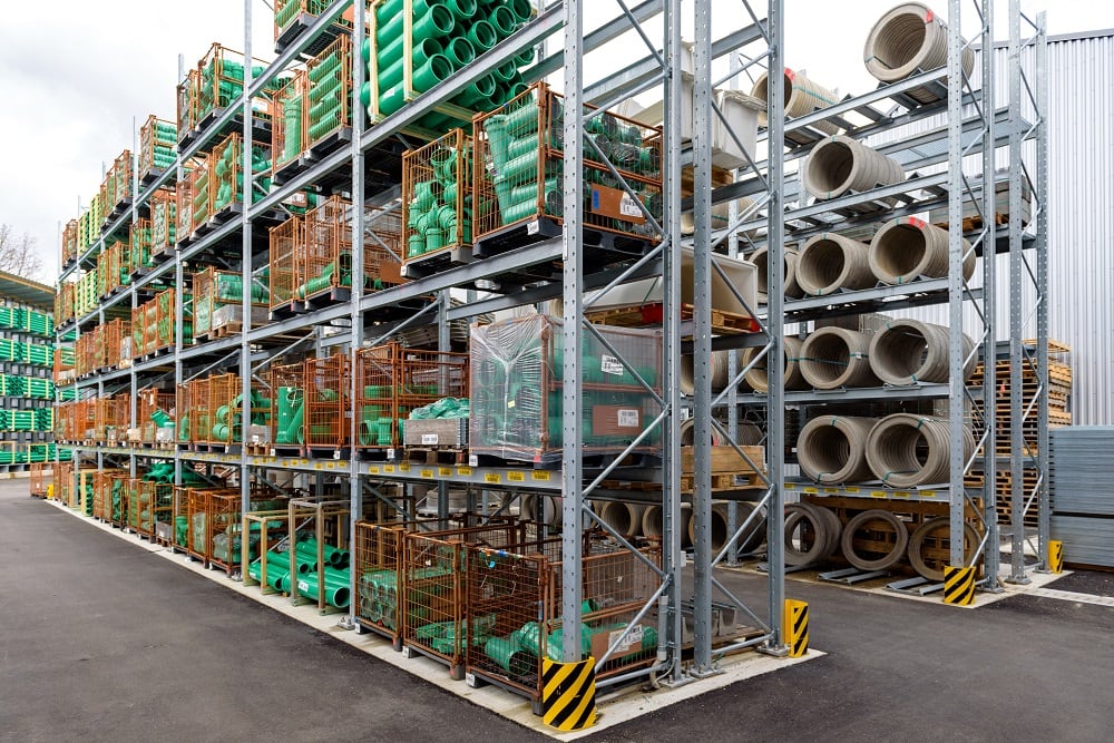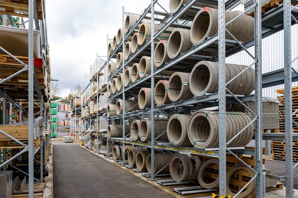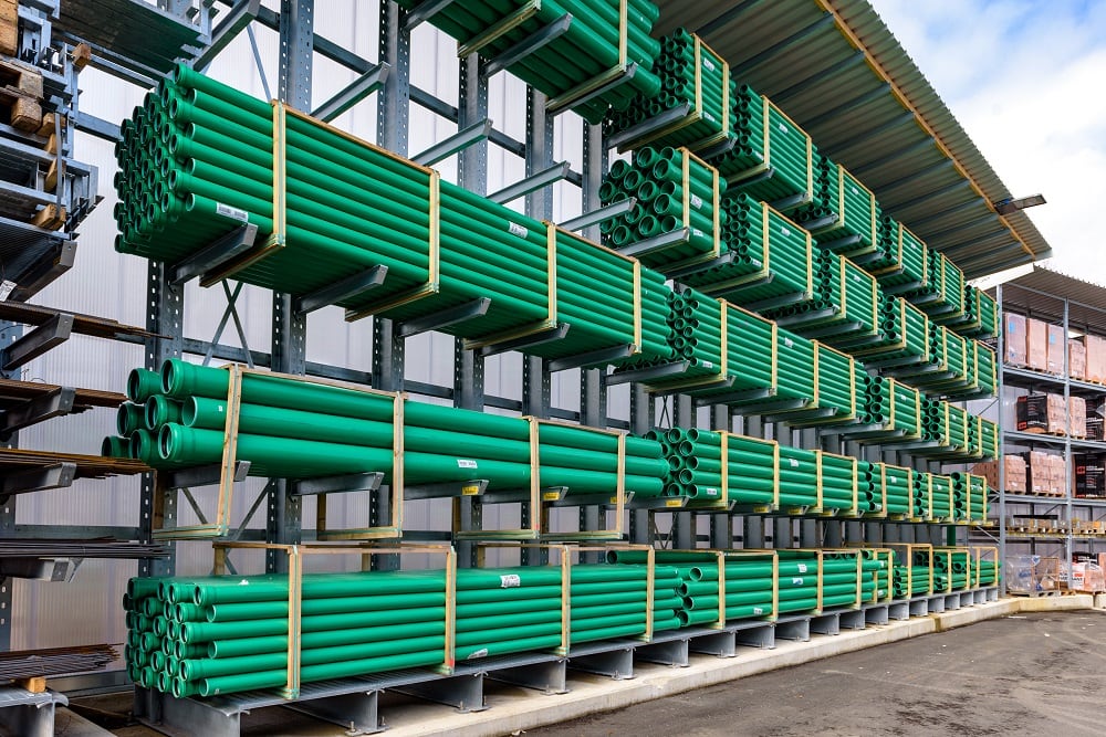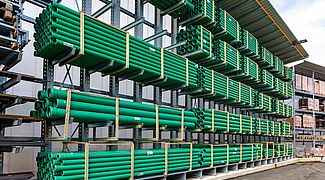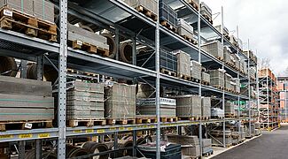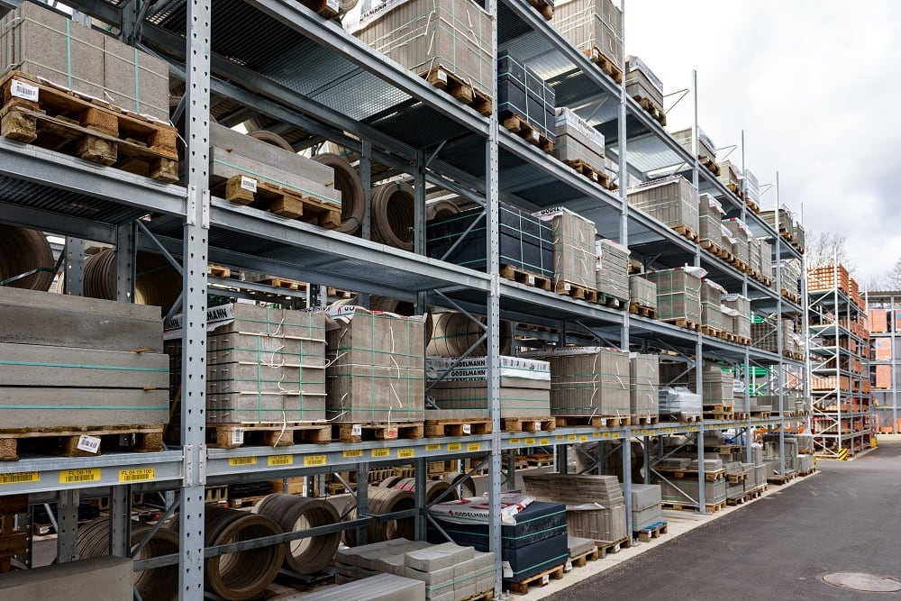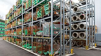 Para el almacenamiento de esta variedad de materiales, Kraft equipó al nuevo almacén externo con estanterías de paletas y cantiléver de OHRA. Ya han convencido a los comerciantes de materiales de construcción de otras ramas por su gran calidad. Porque OHRA sólo utiliza perfiles de acero macizo para los elementos de carga de sus estantes. Esta es la base de la gran capacidad de carga y el diseño fino de los estantes. Las estanterías de paletización permiten cargas de hasta 4.500 kilogramos, las de las estanterías cantiléver soportan hasta 5.000 kilogramos y cada brazo individual soporta hasta 1.000 kilogramos.