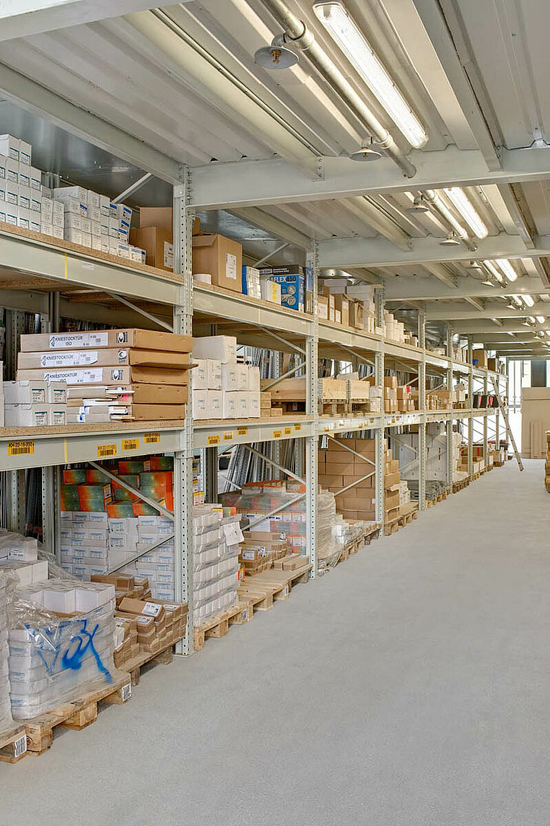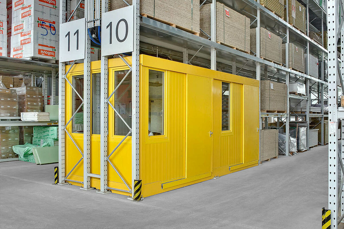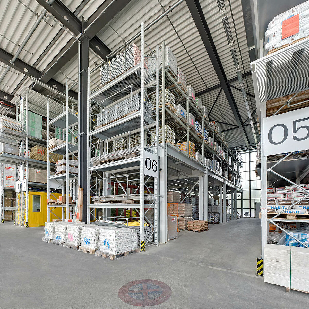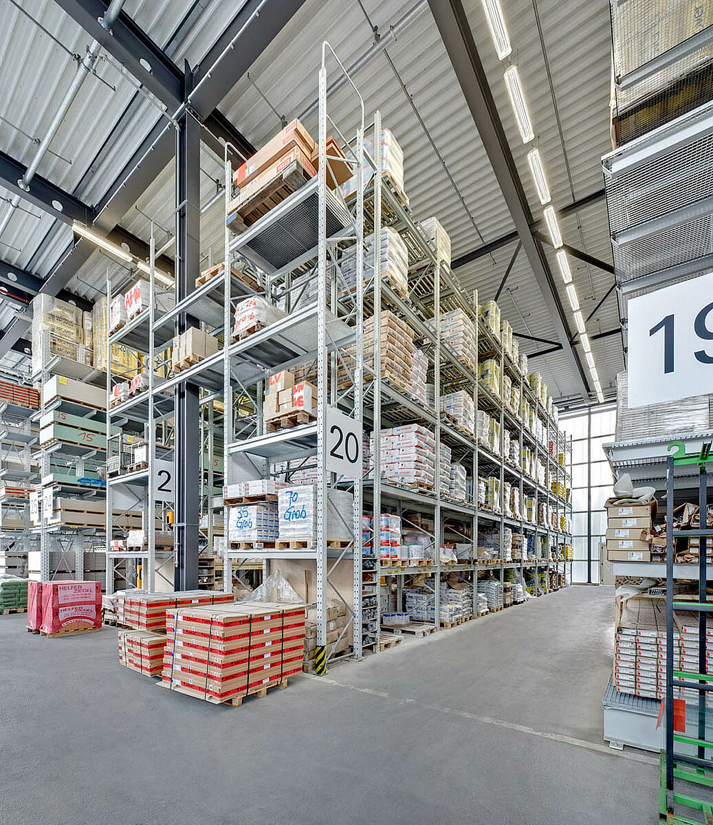 Los materiales de construcción sobre paletas se almacenan de inmediato en el vestíbulo, y también en el área externo sobre estantes de paletas robustos de OHRA. En cada uno de los compartimentos del estante con el ancho de 2.900 mm. se pueden almacenar también sin problemas paletas sobresalientes. Al frente de los estantes de paletas se instalaron estaciones de transferencia para las entregas eficientes y sin problemas. Adicionalmente se pudieron integrar contenedores particulares dentro de la instalación de estantes de paletas por razones de la alta resistencia de carga de los marcos.