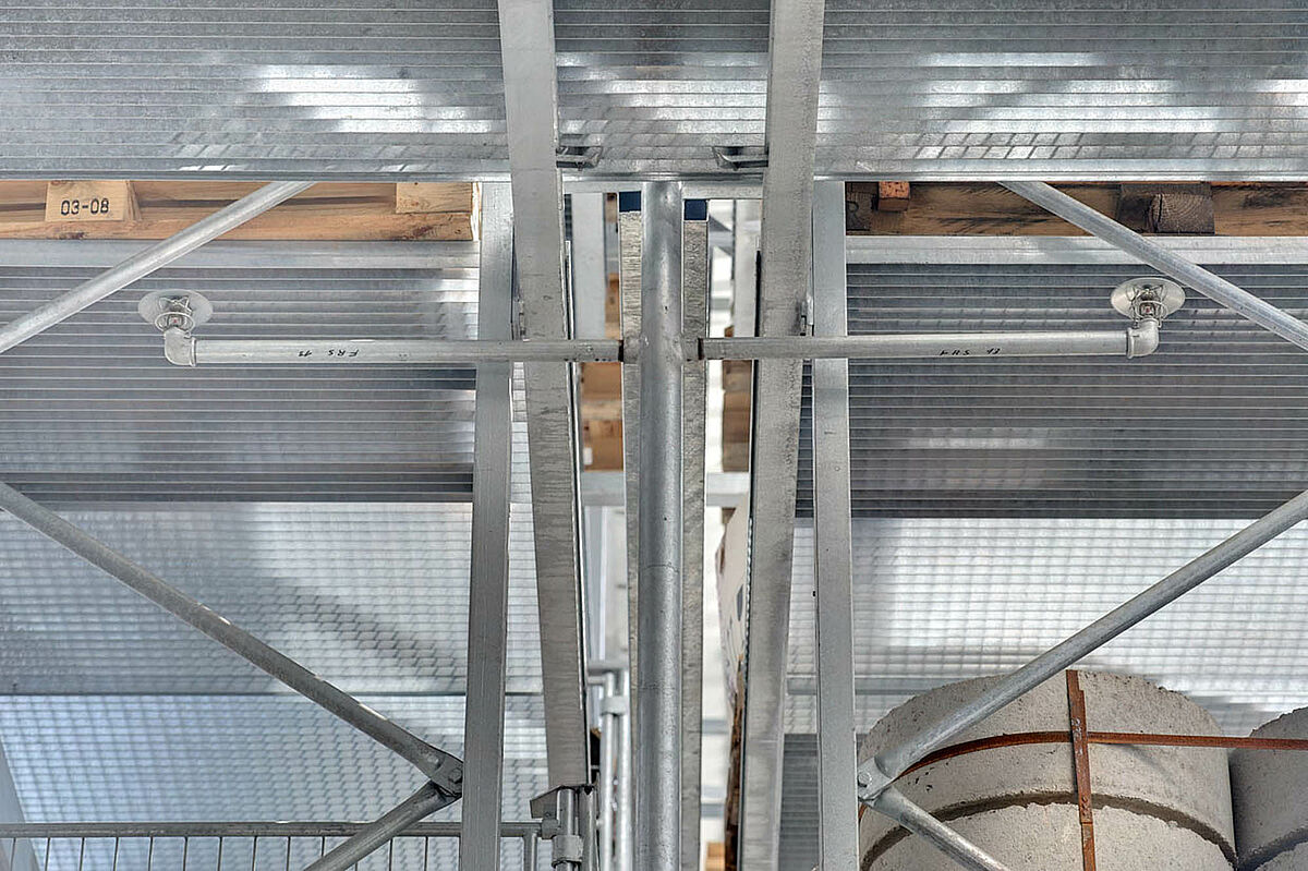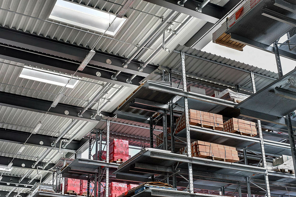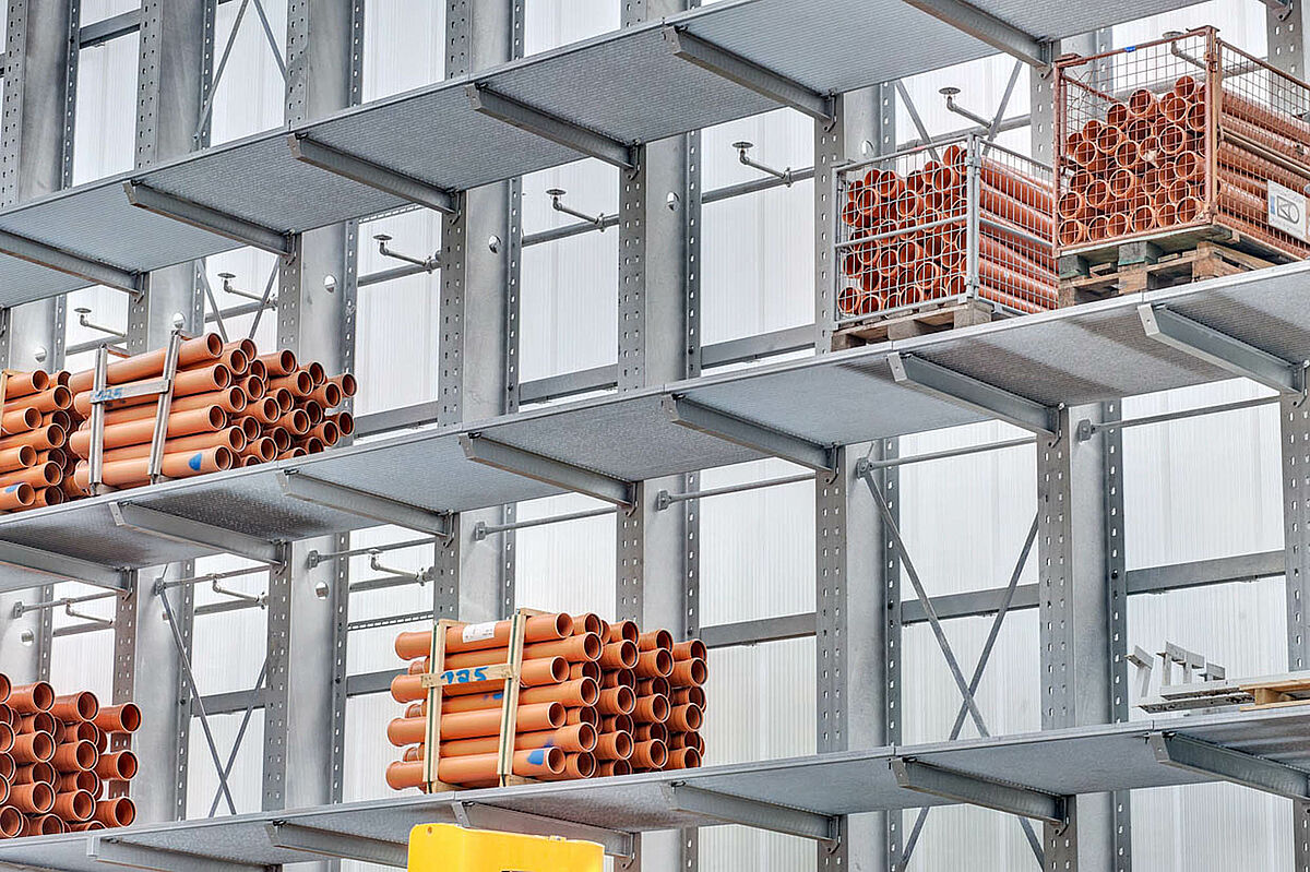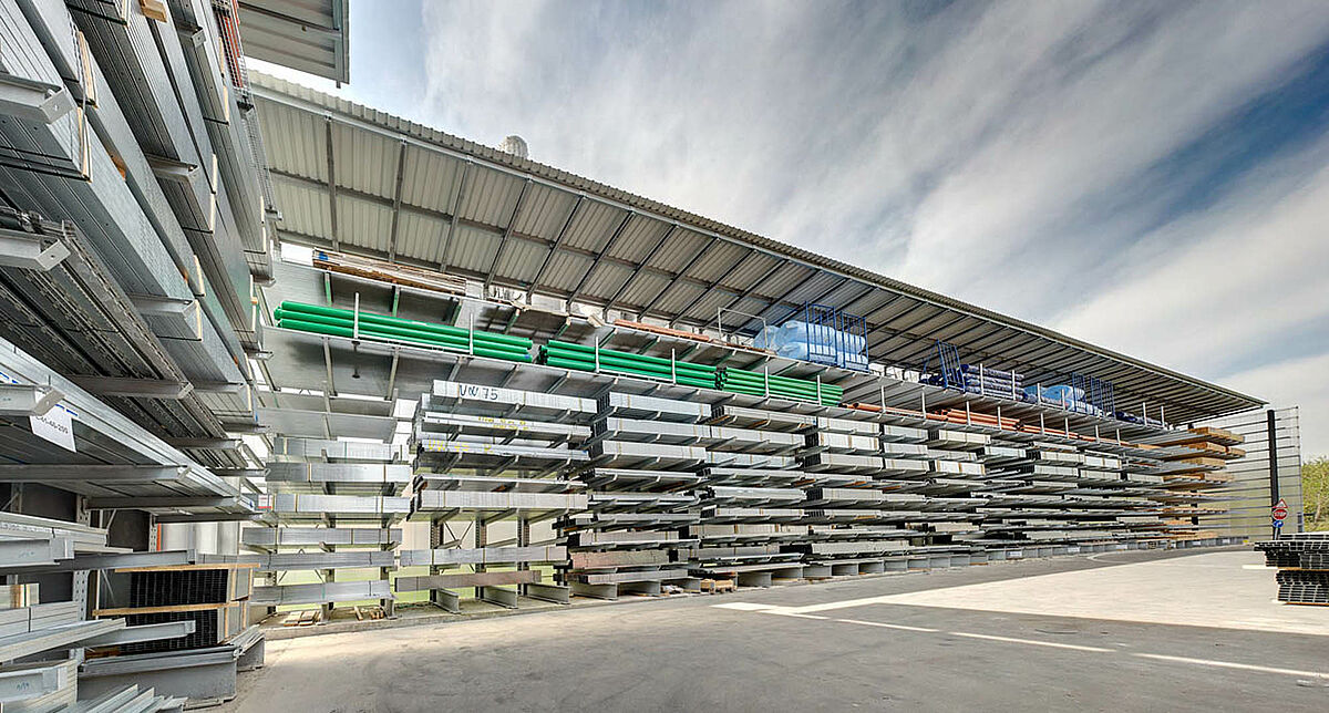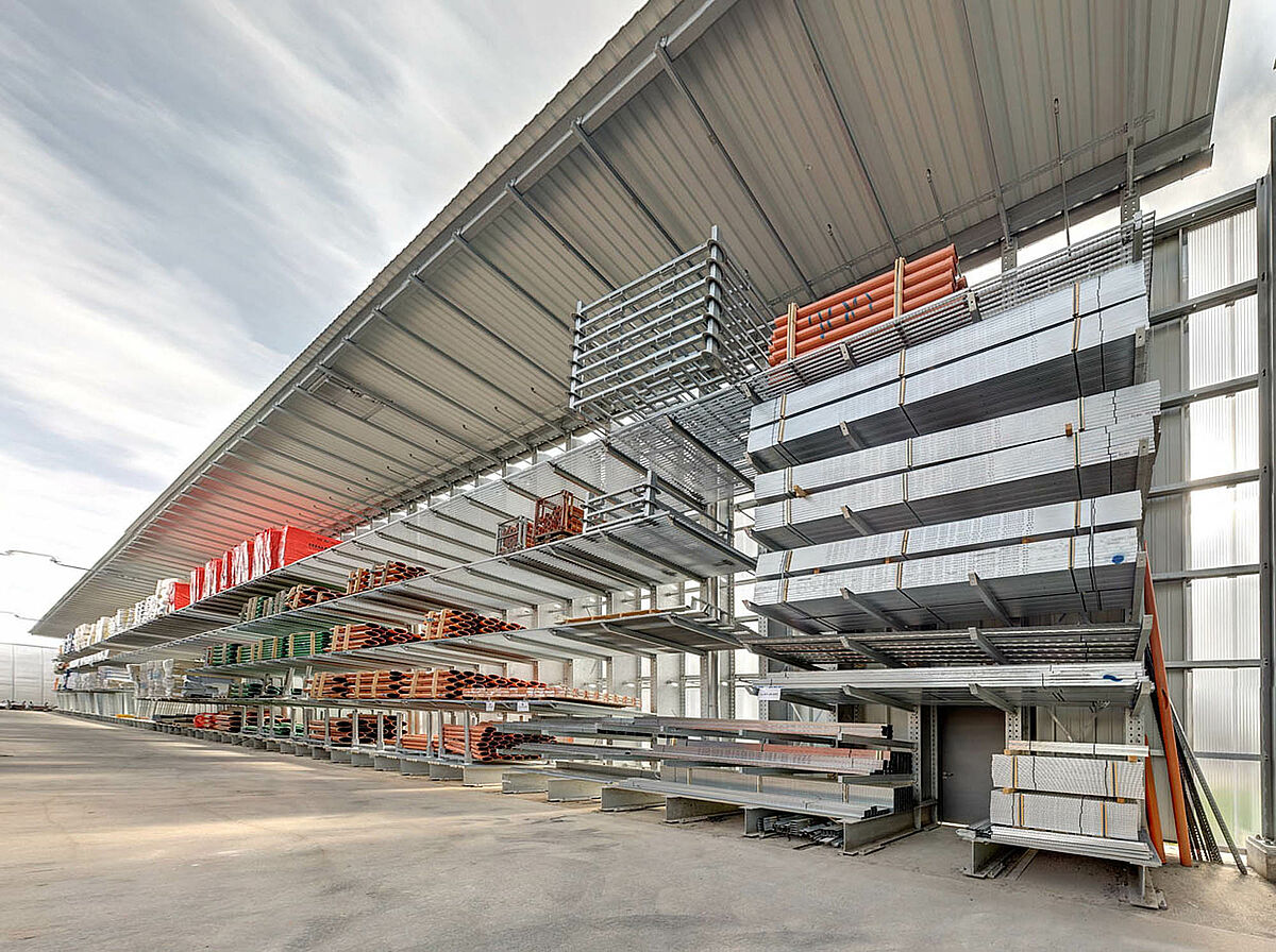 Por ejemplo, fueron suministradas estanterías voladizas en acabados galvanizados en caliente para las áreas exteriores. Aquí se almacenan todos los productos como por ejemplo tubos de desagüe, planchas de hormigón o tablas de madera. La estantería voladiza está en parte techada y tiene rejas como soporte para el material. Un desafío especial fue aquí la construcción del techo inclinado lateralmente caído, el cual fue necesario por el curso del terreno.