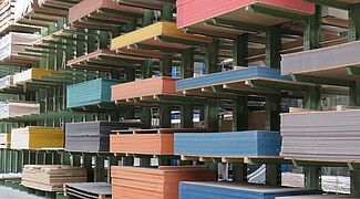 Por ello, OHRA instaló varios sistemas de estanterías en la zona de almacenamiento: Se trata de estanterías cantiléver, cuyos brazos de hasta 1.850 milímetros de longitud tienen una capacidad de carga de hasta 800 kilogramos cada uno; el nivel superior de almacenamiento es de 6,7 metros en su parte más alta. Aquí se almacenan principalmente tableros que tienen una alta rotación y que deben ser recuperados con la correspondiente rapidez.