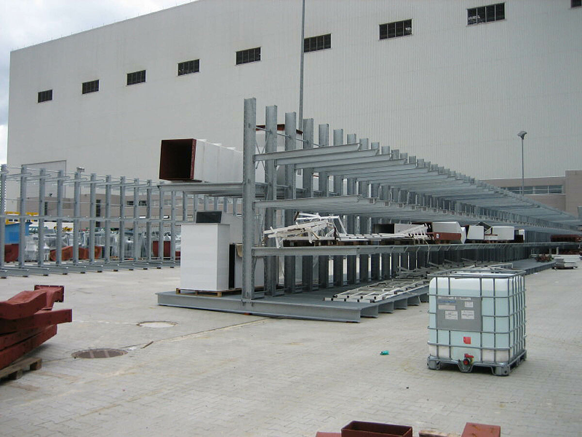 Por los pesos altos y la mala capacidad de carga del suelo se ha desarrollado como solución especial una estructura de base que reparte las cargas puntuales de las columnas individuales en una gran superficie. Para el empleo al exterior se ha realizado la instalación de estanterías en galvanizado en caliente y se ha montado pensado en el cliente por montadores OHRA con experiencia.