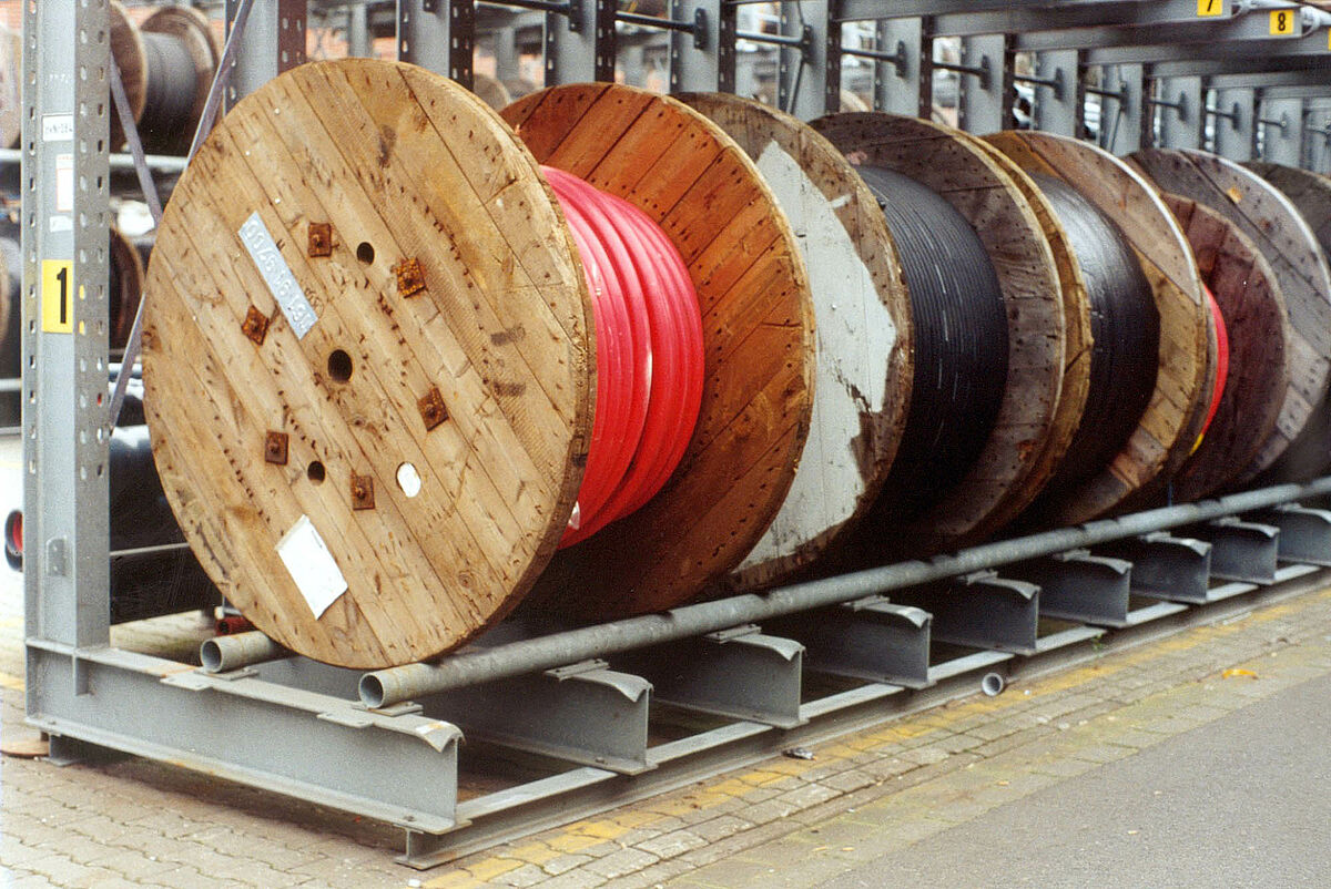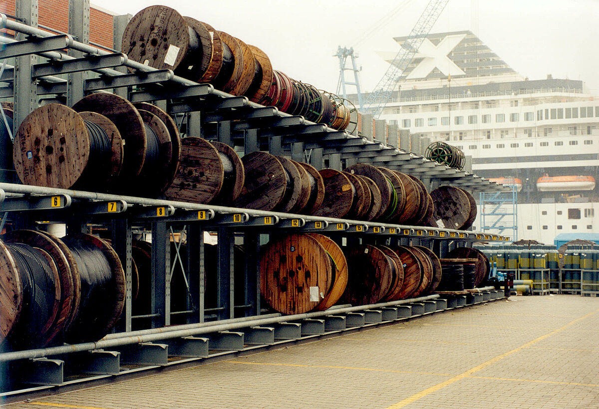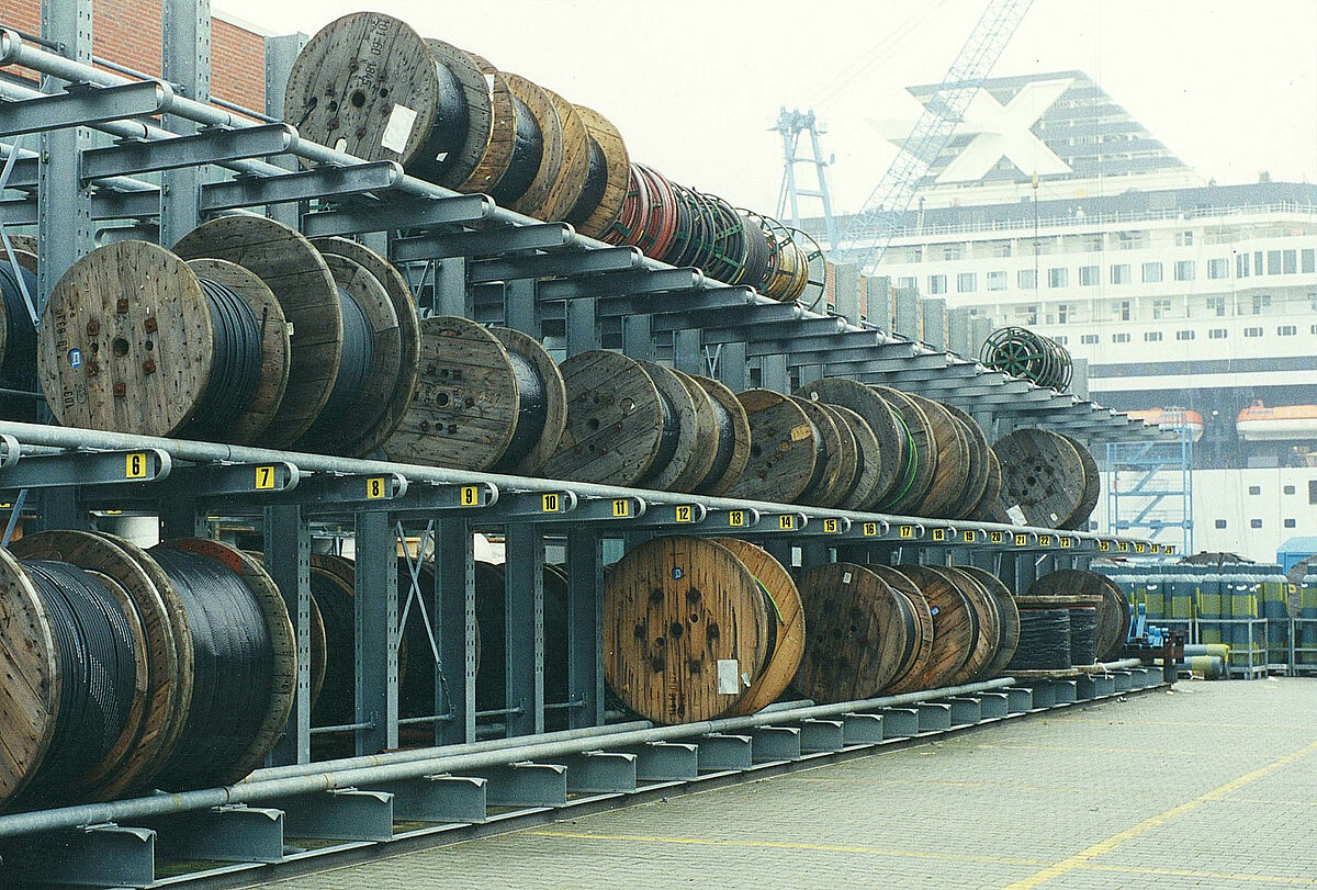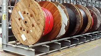 Tambores de cable pesados con diámetros y pesos diferentes se almacenan de manera optima y sin pérdida de espacio en robustas estanterías cantiléver OHRA. Las estanterías son de 4.500 mm de altura y tienen una profundidad máxima de 1.400 mm y 1.200 mm, según el diámetro de los tambores.