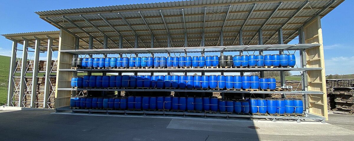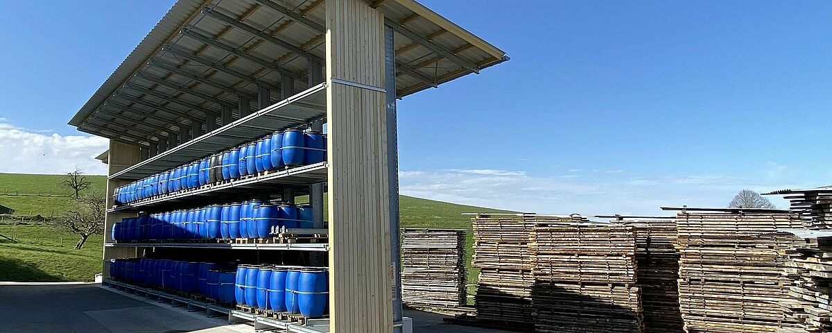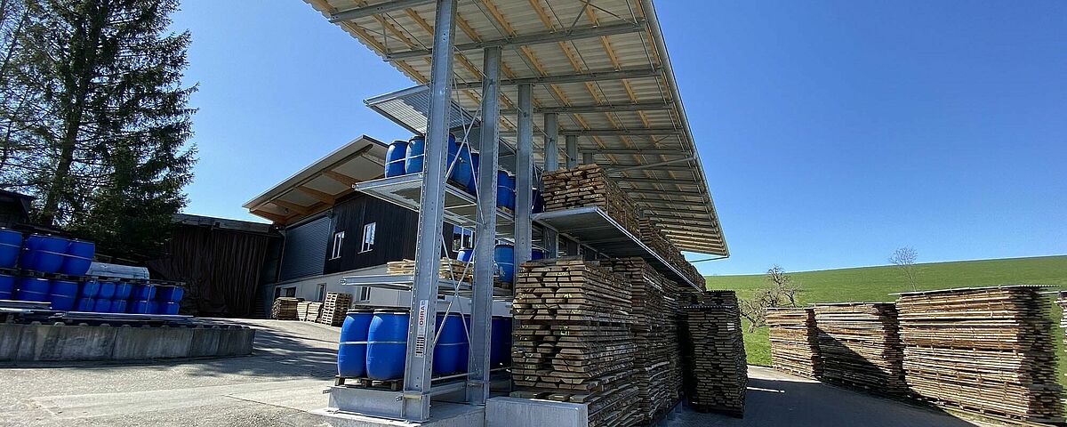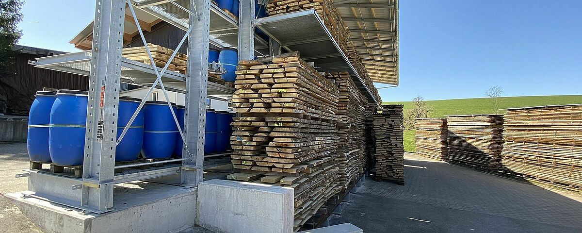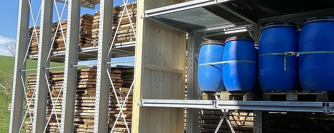 Hasta entonces, Nyfeler almacenaba apiladas en el exterior tablas de bloques de haya, que el taller de carpintería utiliza, entre otras cosas como leña, para la producción del sistema de rieles de bolas CUBORO. Pero los europalés utilizados para este fin se resentían constantemente, dando lugar a montones peligrosamente torcidos. Para llegar a la mercancía, los artículos también tenían que ser apilados de forma engorrosa. Para protegerlos de la intemperie, Nyfeler también cubrió cada pila con lonas, lo que supuso un gran esfuerzo adicional en la manipulación. Por último, también hay que mencionar que el almacén ocupaba una superficie excesivamente grande.