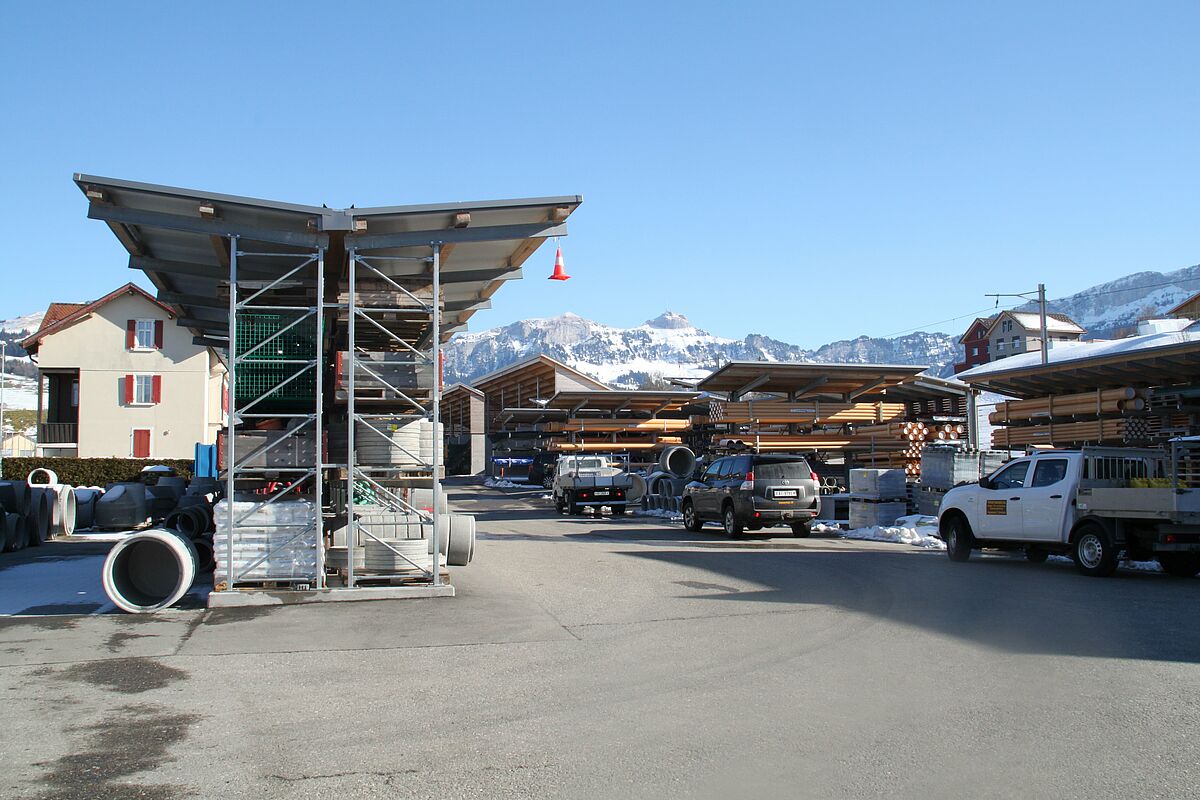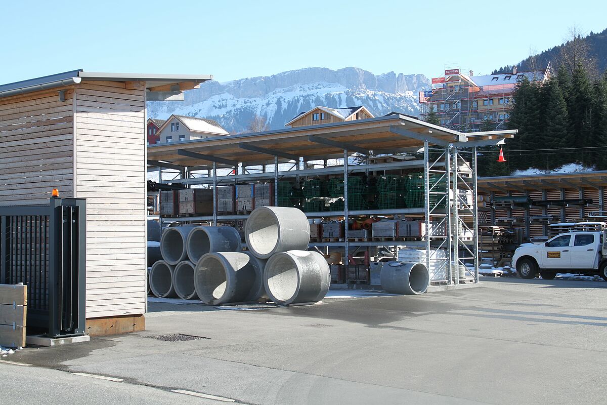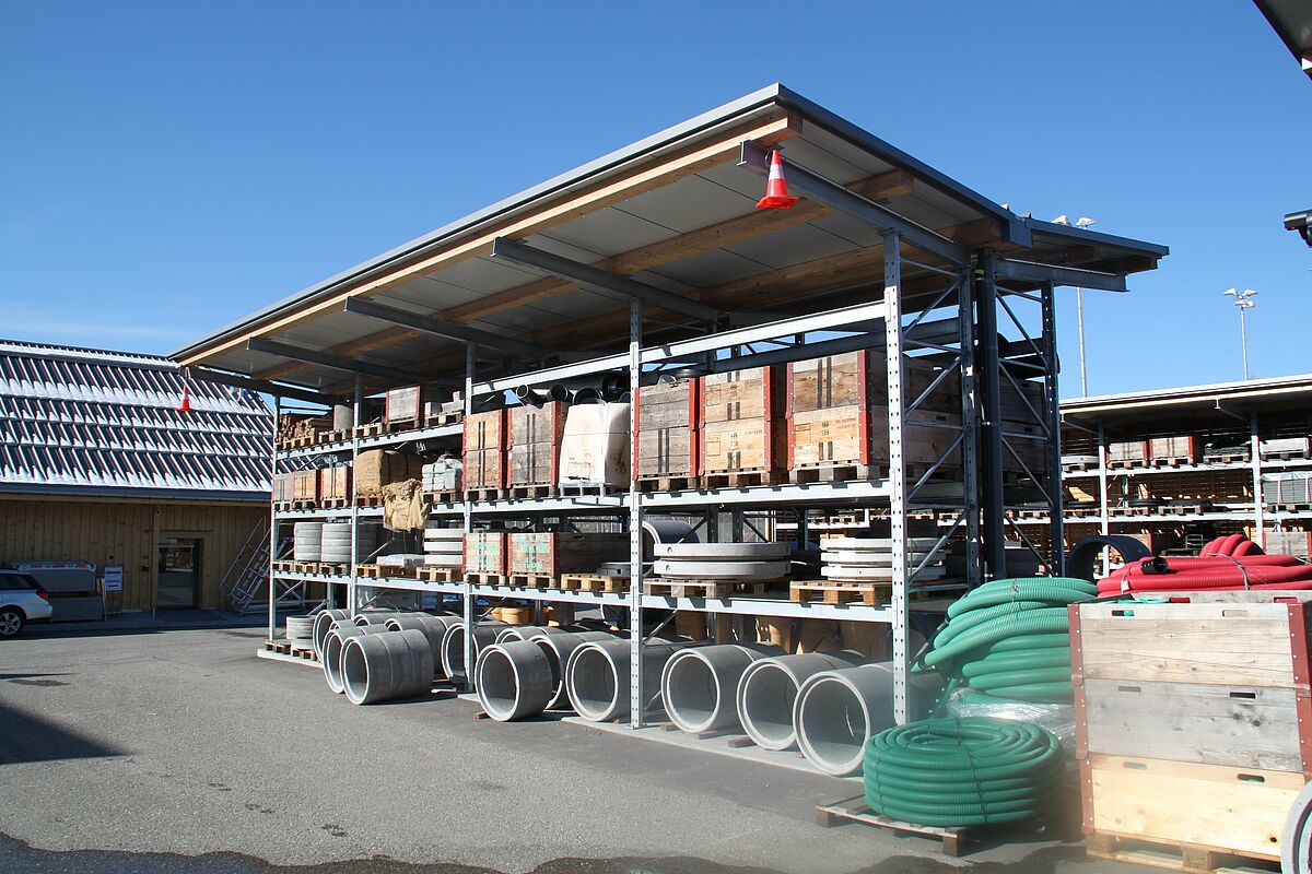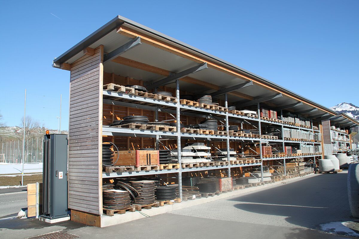 Las estanterías cantiléver y de paletas instaladas en el exterior tienen una cubierta para proteger el material almacenado; OHRA equipó los soportes con los brazos de techo correspondientes, el techado fue realizado por una empresa de construcción local. OHRA diseñó la estática de la estantería para cargas de nieve elevadas de hasta 484 kilogramos por metro cuadrado y cargas de viento de hasta 110 kilogramos por metro cuadrado previstas en Appenzell.