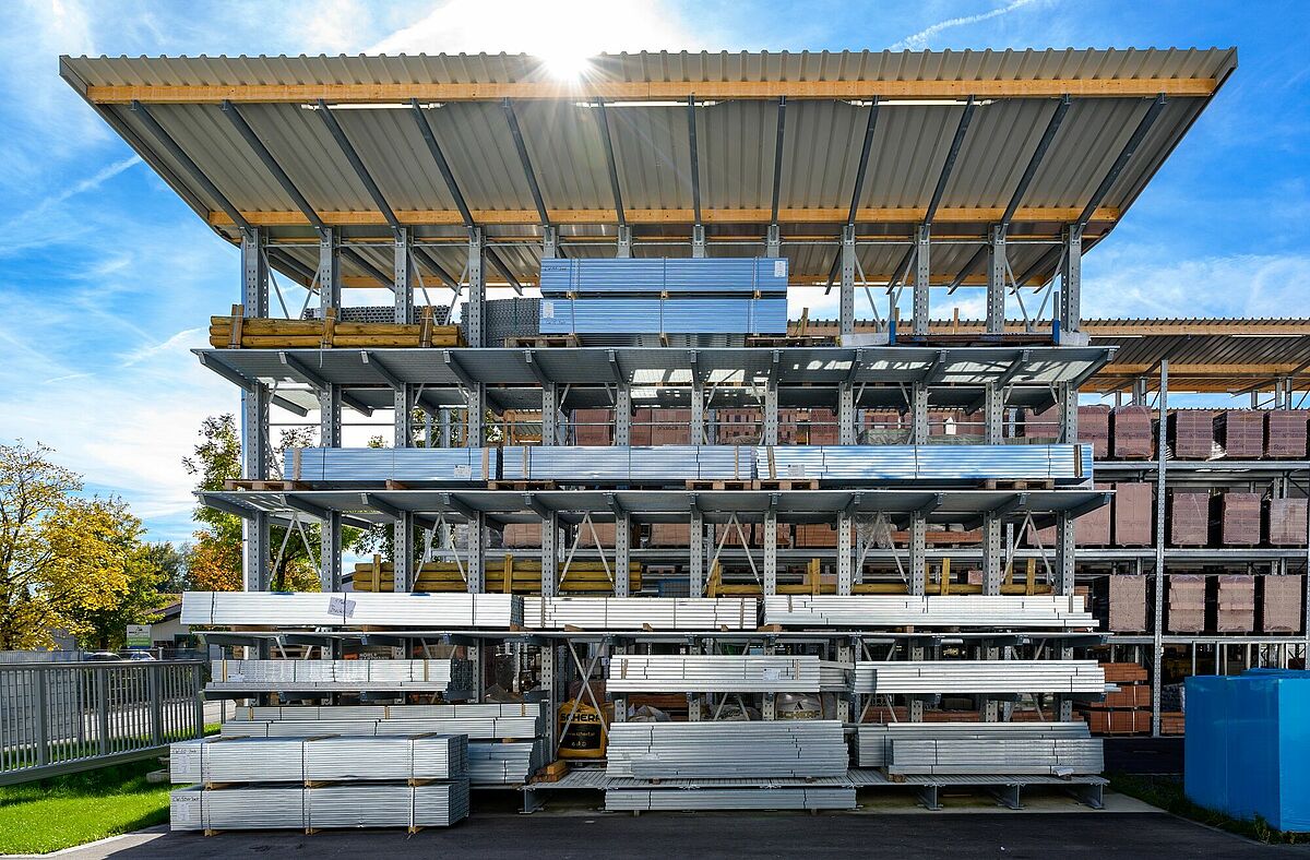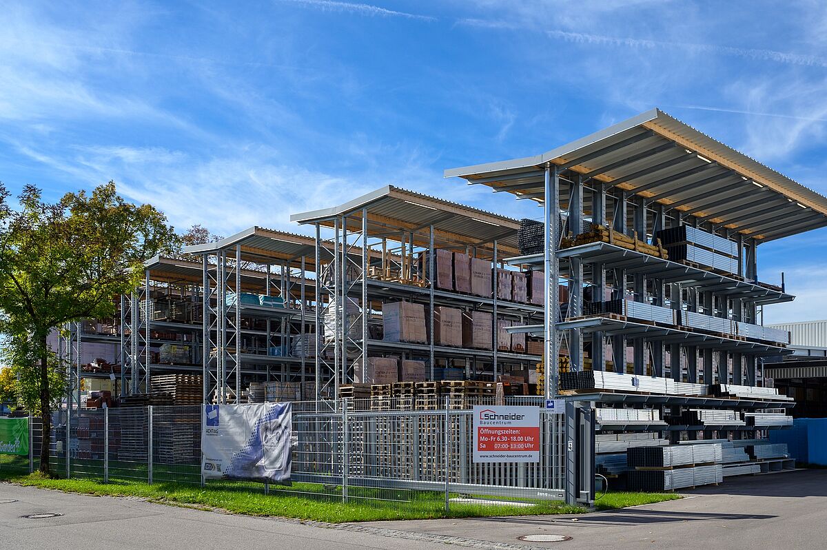 Las estanterías, tanto en la nave como en la zona exterior, se caracterizan por su gran capacidad de carga: Los brazos cantiléver de 1.250 milímetros de longitud pueden cargarse con hasta 1,2 toneladas, las cargas de las estanterías de palés son de hasta 4,5 toneladas. Para poder almacenar de forma flexible la variedad de artículos que transporta el Baucentrum Schneider, OHRA ha equipado las estanterías con rejillas (trámex), de modo que desde los sacos de cemento hasta los europalés pueden almacenarse en cualquier lugar de la estantería.
