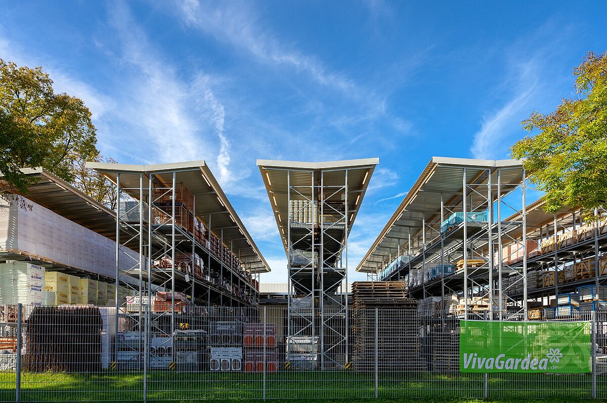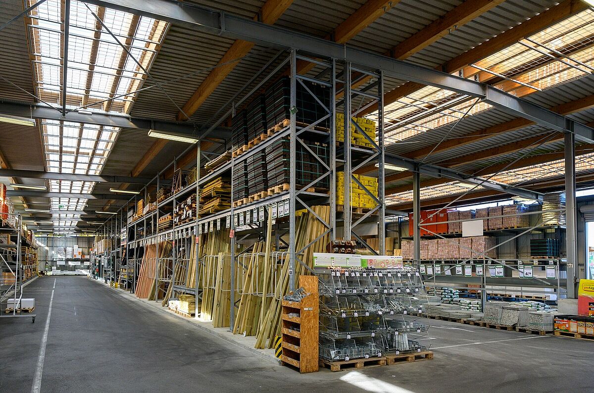 Conducir cómodamente con el vehículo directamente hasta la mercancía deseada y cargarla - especialmente con artículos voluminosos y pesados como materiales de construcción (de jardín) o madera de jardín, concepto drive-in que facilita la compra en la tienda de bricolaje. Schneider también apuesta por este enfoque en el comercio especializado. Los clientes pueden obtener cómodamente la mercancía que necesitan en la zona de tres carriles cubiertos, independientemente de las inclemencias del tiempo. La nave ha sido diseñada por OHRA como una sala autoportante. Además, las columnas de las estanterías a la vez sirven como subestructura portante para la construcción de la nave. Esto reduce la duración del proyecto y ofrece considerables ventajas económicas. La nave autoportante se complementa con estanterías cantiléver y de palés en la zona exterior, donde las mercancías están protegidas de la intemperie por un techo integrado. Ambas zonas están conectadas por un techo de 13 metros de longitud Además, OHRA realizó una nave aislante libre de heladas, en la que los productos químicos para la construcción, así como los revestimientos del suelo, se almacenan de forma segura junto a una zona de oficinas.