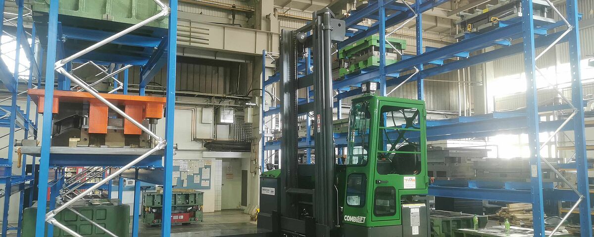 En comparación con el almacenamiento alternativo en el suelo, Solvaro puede almacenar una cantidad significativamente mayor de herramientas de embutición profunda en el espacio disponible con el nuevo sistema de estanterías. Sin embargo, lo más importante es el acceso directo y rápido a las herramientas: Una carretilla elevadora especial de Combilift, adquirida especialmente para las herramientas de embutición, puede levantar fácilmente las pesadas herramientas de la estantería y trasladarlas directamente a la prensa. Al mismo tiempo, las herramientas de embutición profunda están protegidas de daños en todo momento gracias a la construcción a medida de la estantería.