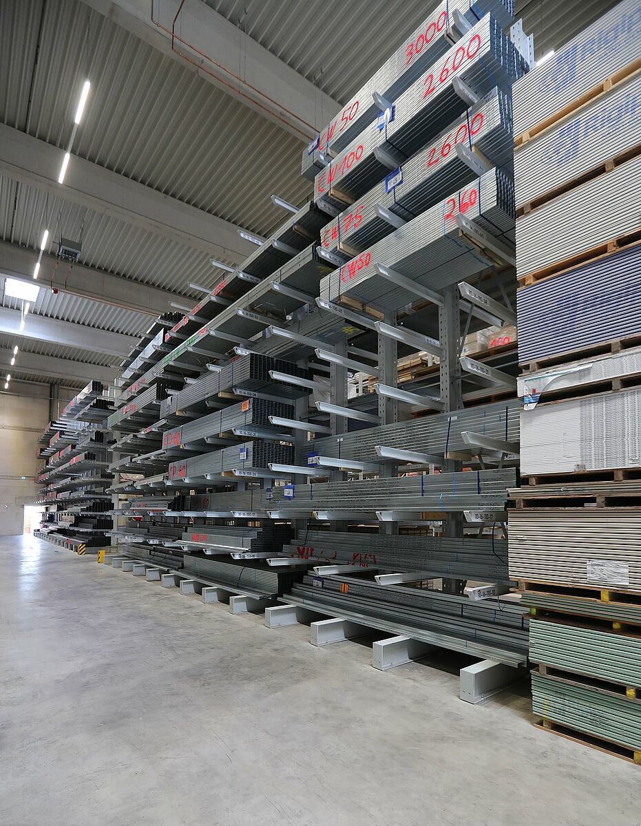 En total, OHRA entregó más de 25 estanterías cantiléver y de paletización para uso en interior y en exteriores. Cada estantería se adapta específicamente al lugar de instalación y a las mercancías que se van a almacenar en ella. Por ejemplo, el vano de las estanterías de paletización oscila entre 2.400 y 4.500 milímetros, con cargas de 3 a 5,5 toneladas. La capacidad de carga de la construcción de las estanterías de OHRA permite, con seis niveles de almacenamiento en las estanterías de paletización, un buen aprovechamiento de la altura de la sala. Lo mismo se aplica para las estanterías cantiléver: tienen una capacidad de carga de hasta 6.750 kilogramos por lado de columna. Según las mercancías, se pueden utilizar hasta nueve niveles de almacenamiento. Los brazos regulables, con una capacidad de carga de 750 kilogramos, permiten una fácil adaptación a una enorme gama de mercancías.
