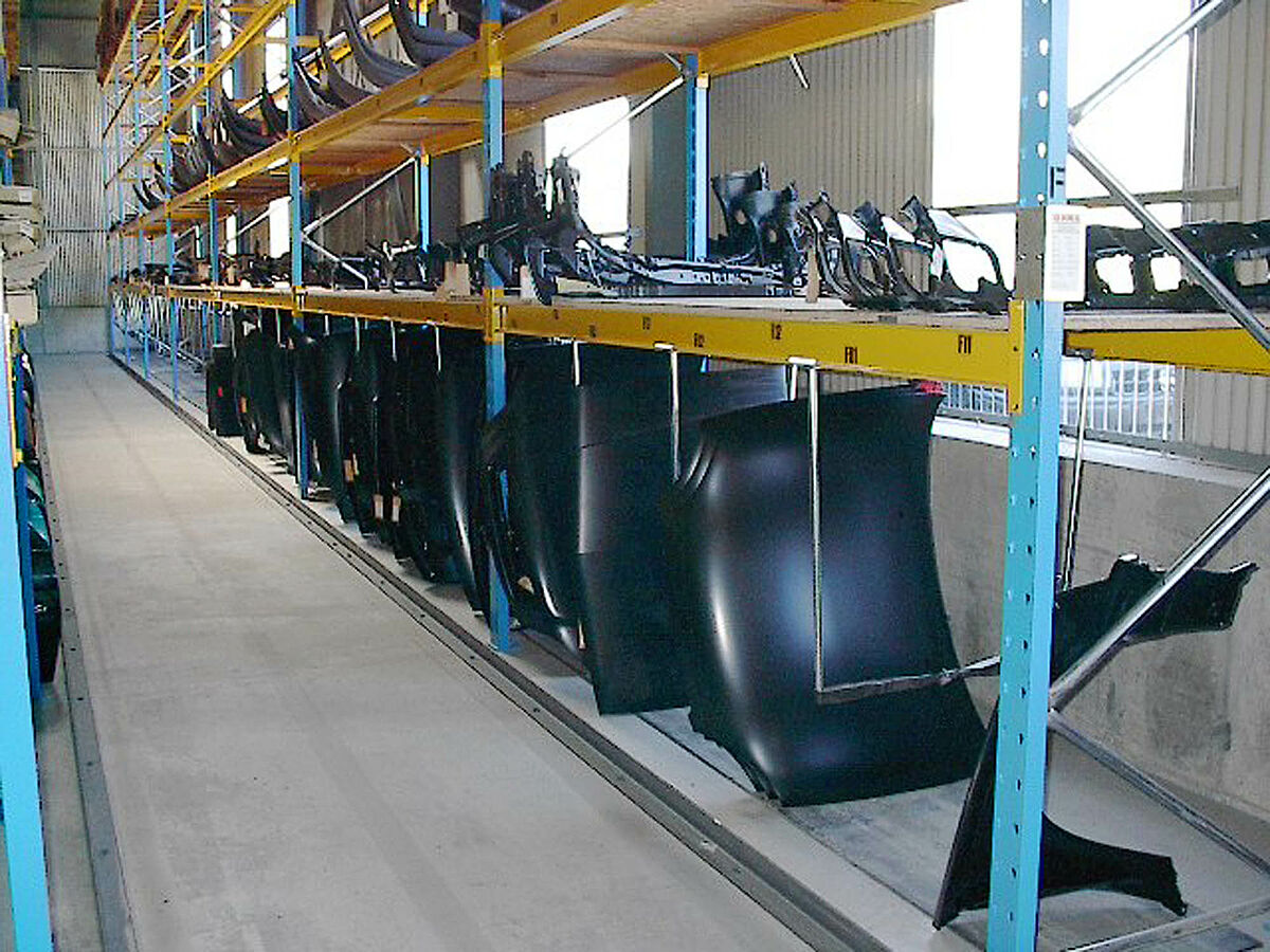 Posibilidad de almacenamiento para 18 coches. La misma cantidad de vehículos antiguos requiere solamente un área de 48 m² gracias al almacenamiento en estanterías cantilever robustas. Ahora se accede directamente a cada vehículo. Ya no existe dificultad para mover los vehículos.