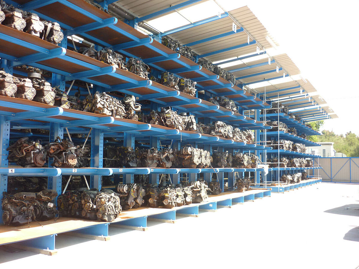 Especialmente para los recicladores de vehículos y servicios de remolque, OHRA ha desarrollado y optimizado la estantería cantilever para los vehículos y piezas de repuestos. Este sistema de almacenamiento tiene suficientes reservas de potencia para el almacenamiento seguro en altura, así como el acceso directo a la carga. Esto logra economizar enormemente el espacio y transformar los procesos de reciclaje en más económicos debido a un menor coste de manipulación. Los perfiles de acero laminados en caliente en todos los elementos portantes de la estantería cantilever permiten el almacenamiento seguro de varios coches uno encima del otro. La alta calidad de los soportes de las estanterías y los brazos cantilever garantizan una solución duradera y económica de almacenamiento en empresas de recicladores de automóviles y de servicios de remolque y grúa.