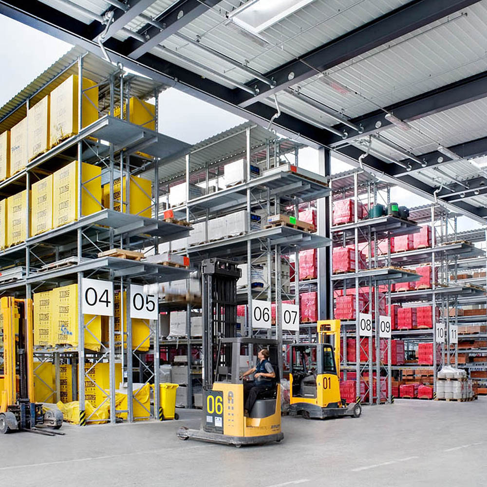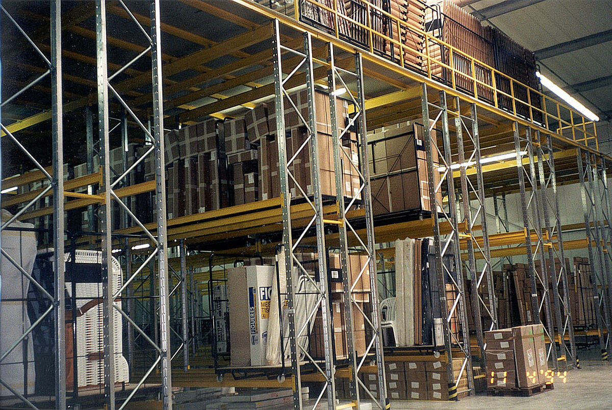 La fusión de estantes y plataformas crea posibilidades individuales y versátiles del almacenamiento, por ejemplo, como combinación de zona de expedición y trabajo con muchas posibilidades de almacenamiento. Gracias a los perfiles de acero macizo, laminados en caliente y procesados por OHRA, de las estanterías para paletas, podemos tener varias plantas dentro de la instalación de estanterías.