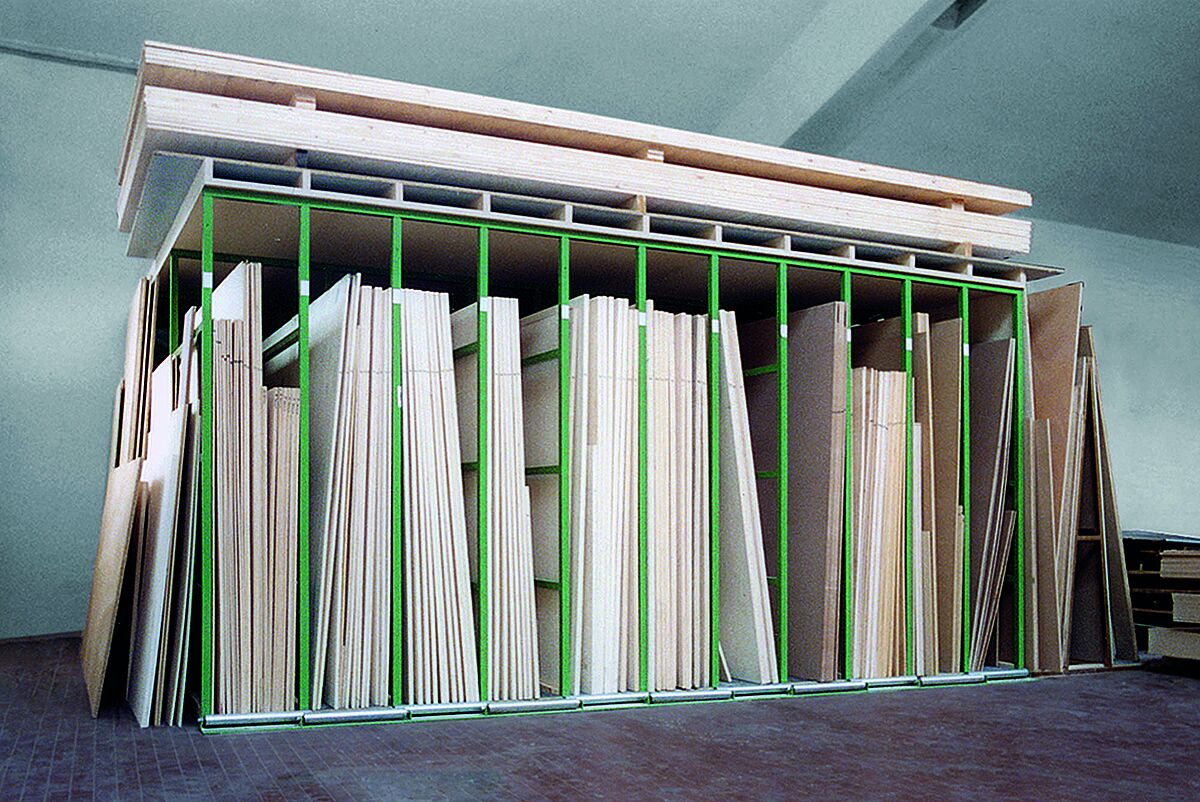 Una especialidad de OHRA es el estante de placas de aglomerado para el almacenamiento vertical de placas de aglomerado y materiales de diferentes calidades y medidas. El sistema de estantería robusto garantiza una alta capacidad de carga y un manejo rápido en el taller.